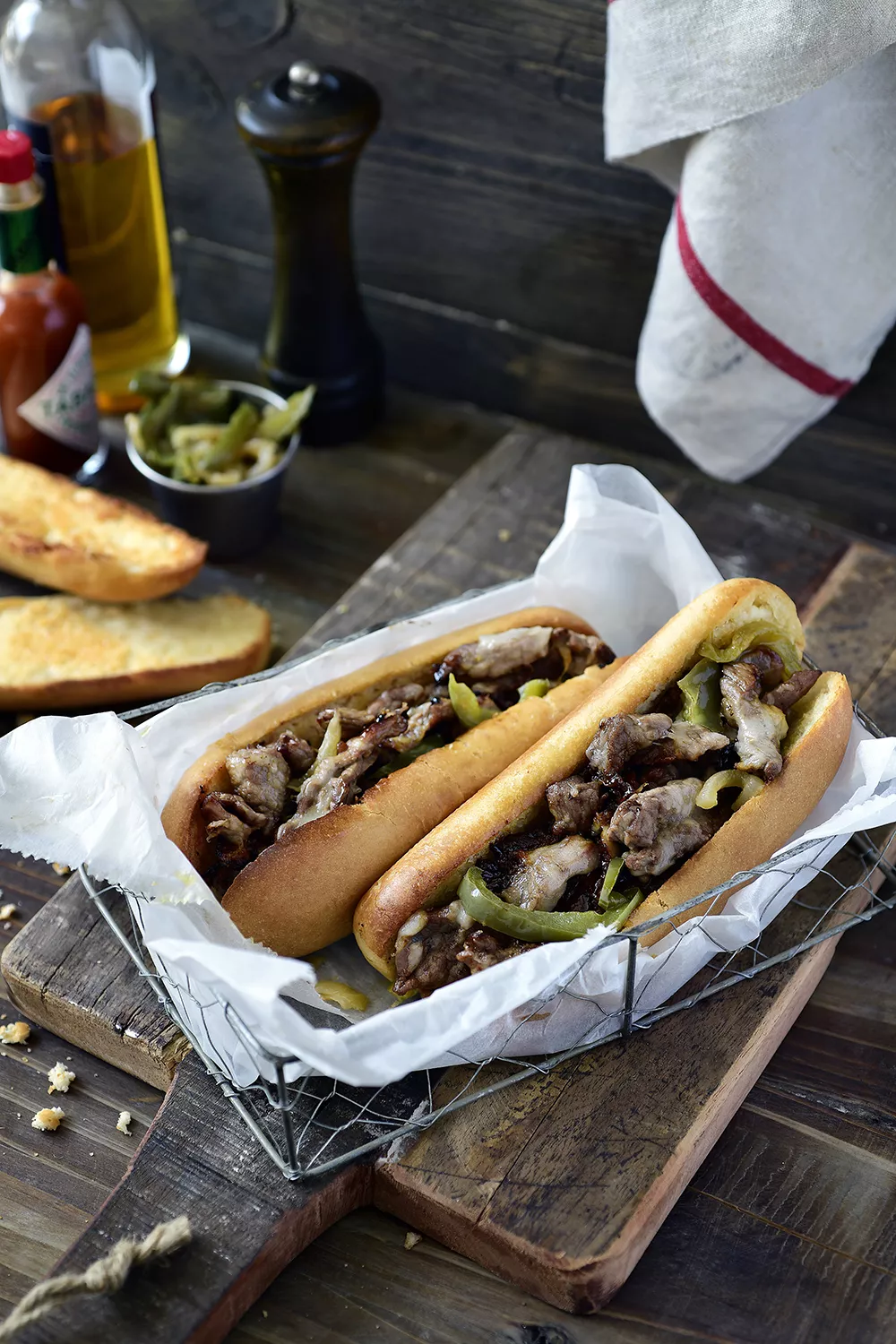 Romige Philly cheesesteak met malse entrecote, gesmoorde ui en paprika en gesmolten provolone in knapperige hotdogbroodjes. Het vlees wordt kort op hoog vuur aangebraden en met worcestersaus en wittewijnazijn gekaramelliseerd, de broodjes gaan nog even onder de grill voor extra bite. Perfect als hartige lunch, comfortmaaltijd of gezellige borrelhap in elk seizoen.