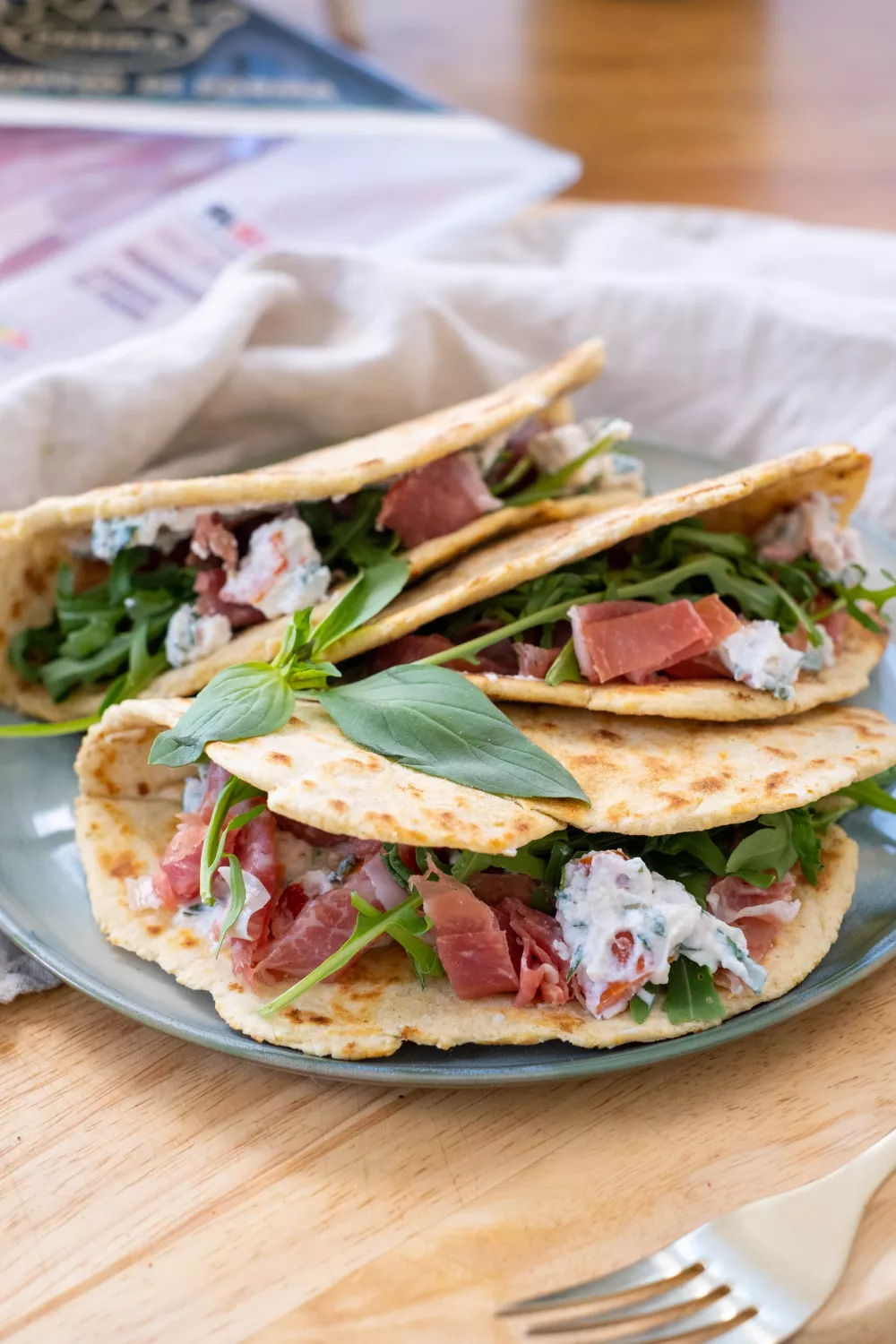 Beleg de piadina’s met het ricottamengsel en werk nog af met de Parmaham en rucola.