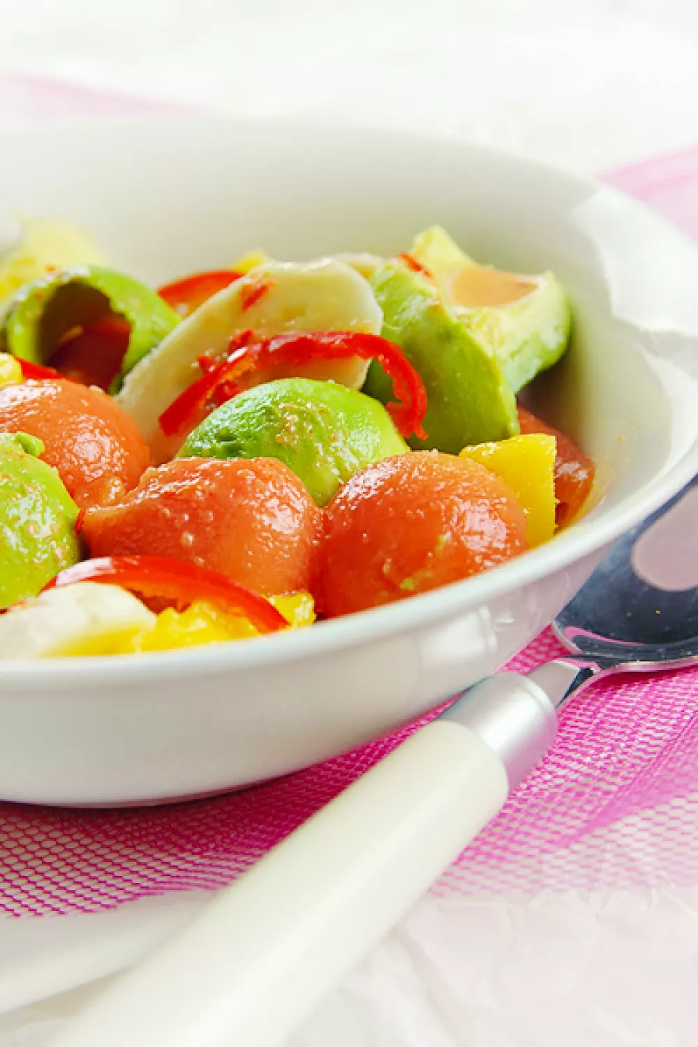 Deze pittige fruitsalade zet de zomer op tafel: sappige mango, papaja, ananas en banaan met romige avocado krijgen een tropische kick van peppadew, citroen en appelsap. De feloranje dressing met olijfolie mix je razendsnel met de staafmixer en werk je af met munt. Ideaal als licht fruitdessert, frisse salade bij brunch, picknick of barbecue.