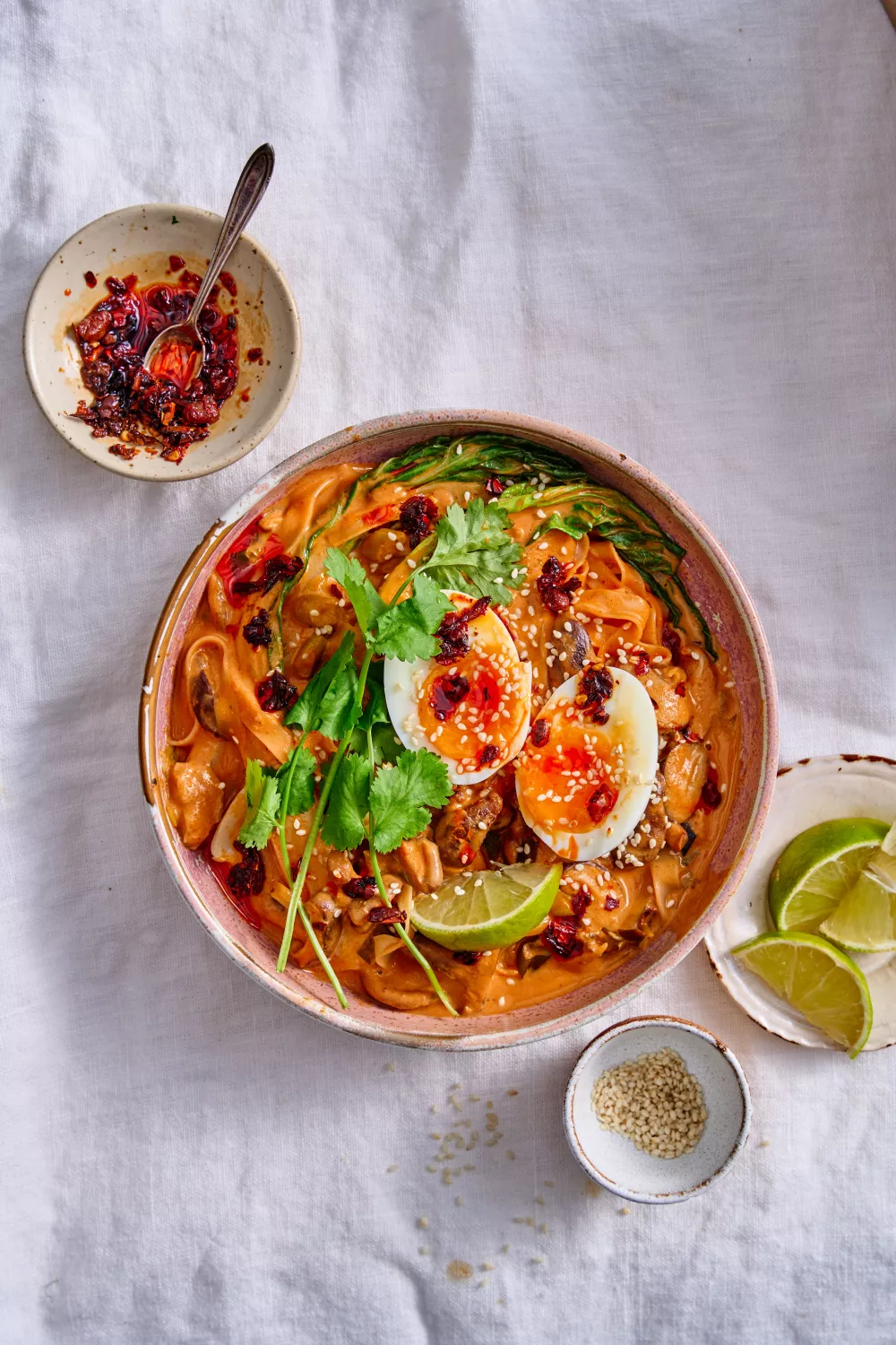 Serveer de soep met een doorgesneden eitje, de pinda’s, sesamzaadjes, koriander, een limoenpartje en eventueel extra crispy chili-olie.