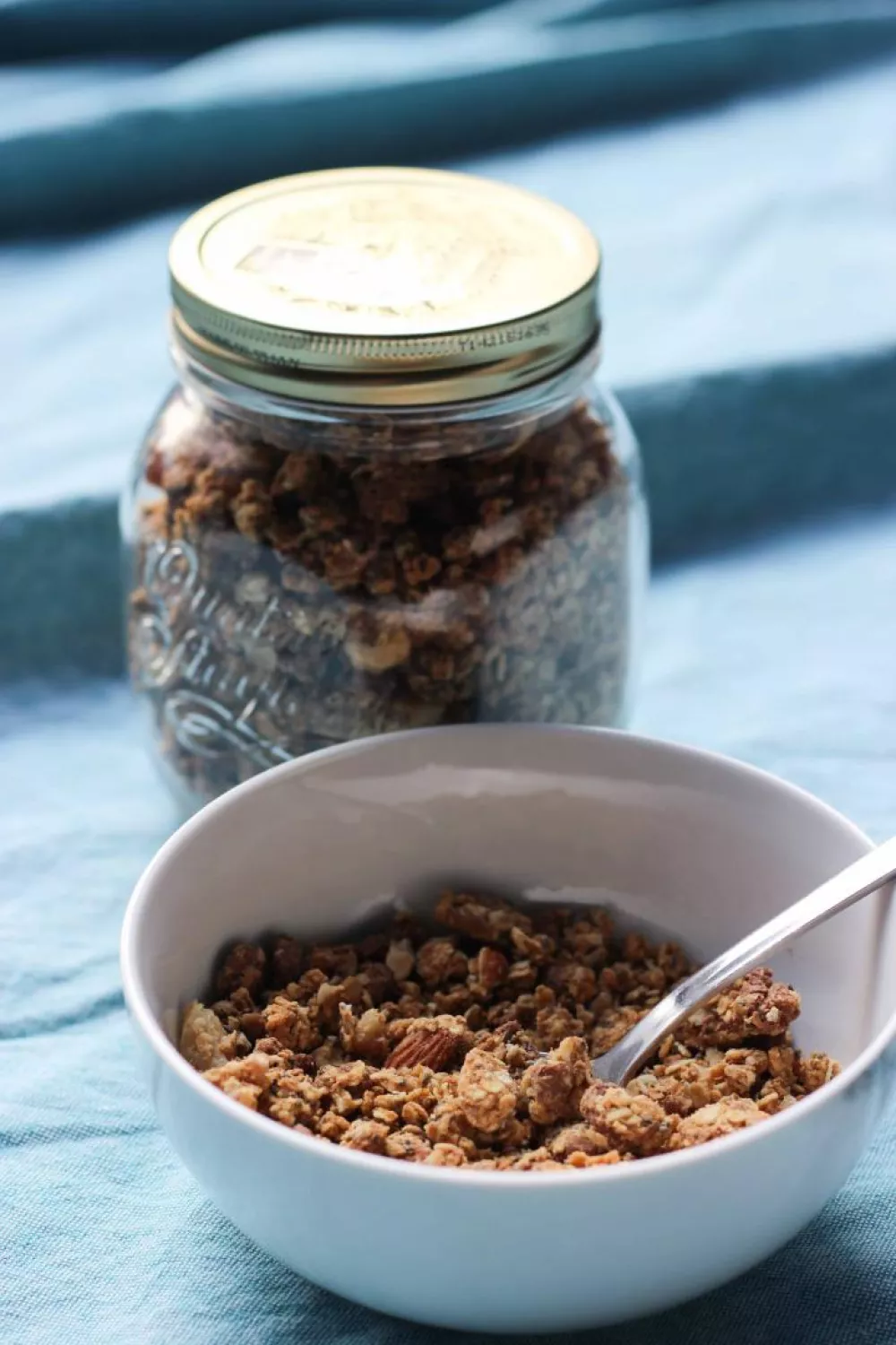 Laat de granola volledig afkoelen en bewaar in een luchtdichte bokaal.