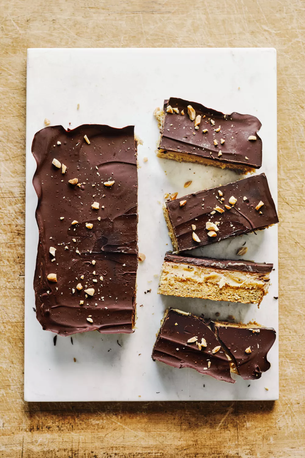 15 minuten in de koelkast, of tot de chocolade gestold maar nog wel zacht is. Hak de resterende pinda’s vrij grof. Haal de koek uit het bakblik en garneer hem met de gehakte pinda’s. Snijd de koek in 8 repen of 16 kleine vierkantjes.