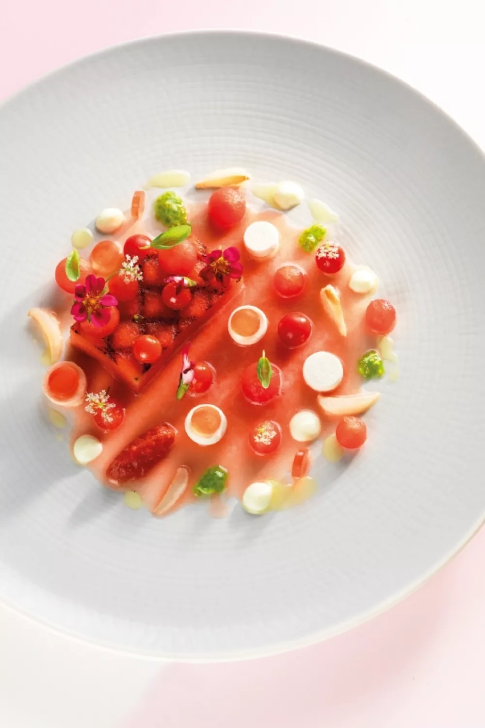 Schik de gegrilde watermeloen en de gekarameliseerde tomaatjes mooi op een bord. Leg er enkele hot lips-bloemetjes, zeste van limoen, tomatenschuimpjes, blaadjes munt, compote van tomaat, basilicumblaadjes en enkele bolletjes watermeloen bij. Werk verder af met rondjes lychee-rozengelei en besprenkel met de gazpacho van watermeloen.