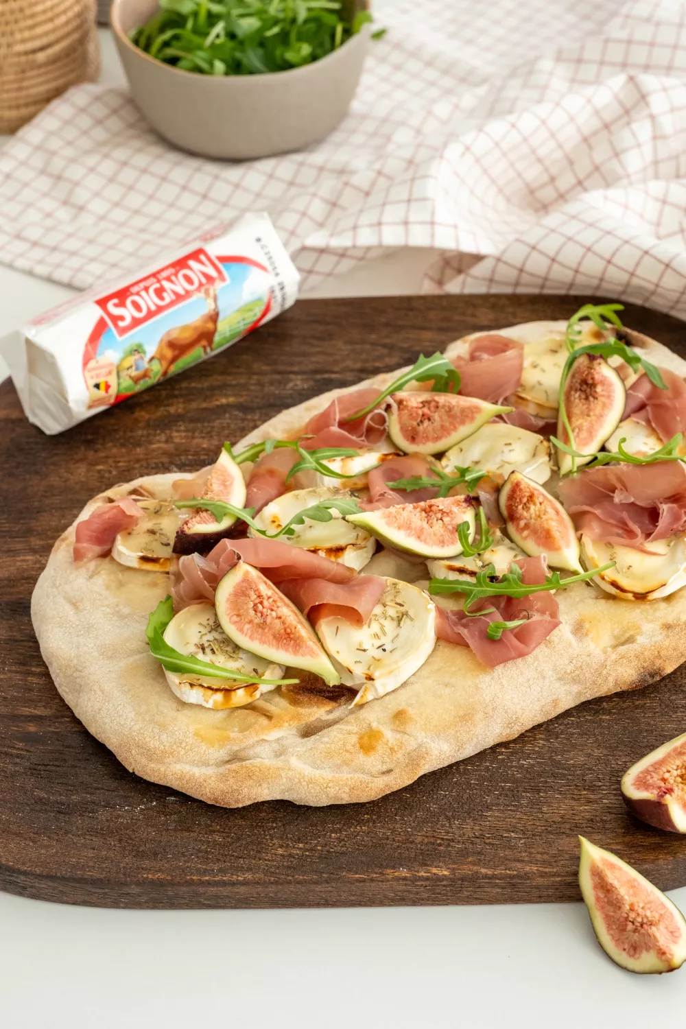 Pinsa met geitenkaas, rauwe ham en vijgen