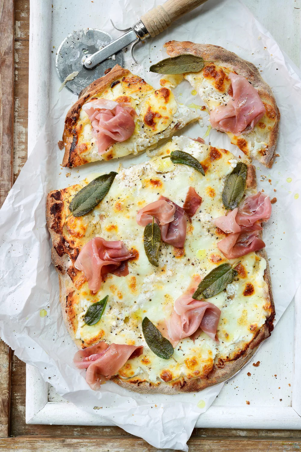 Haal de pinsa uit de oven en verdeel er de plakjes Italiaanse ham en de salieblaadjes over. Besprenkel nog met de salieboter alvorens te serveren.