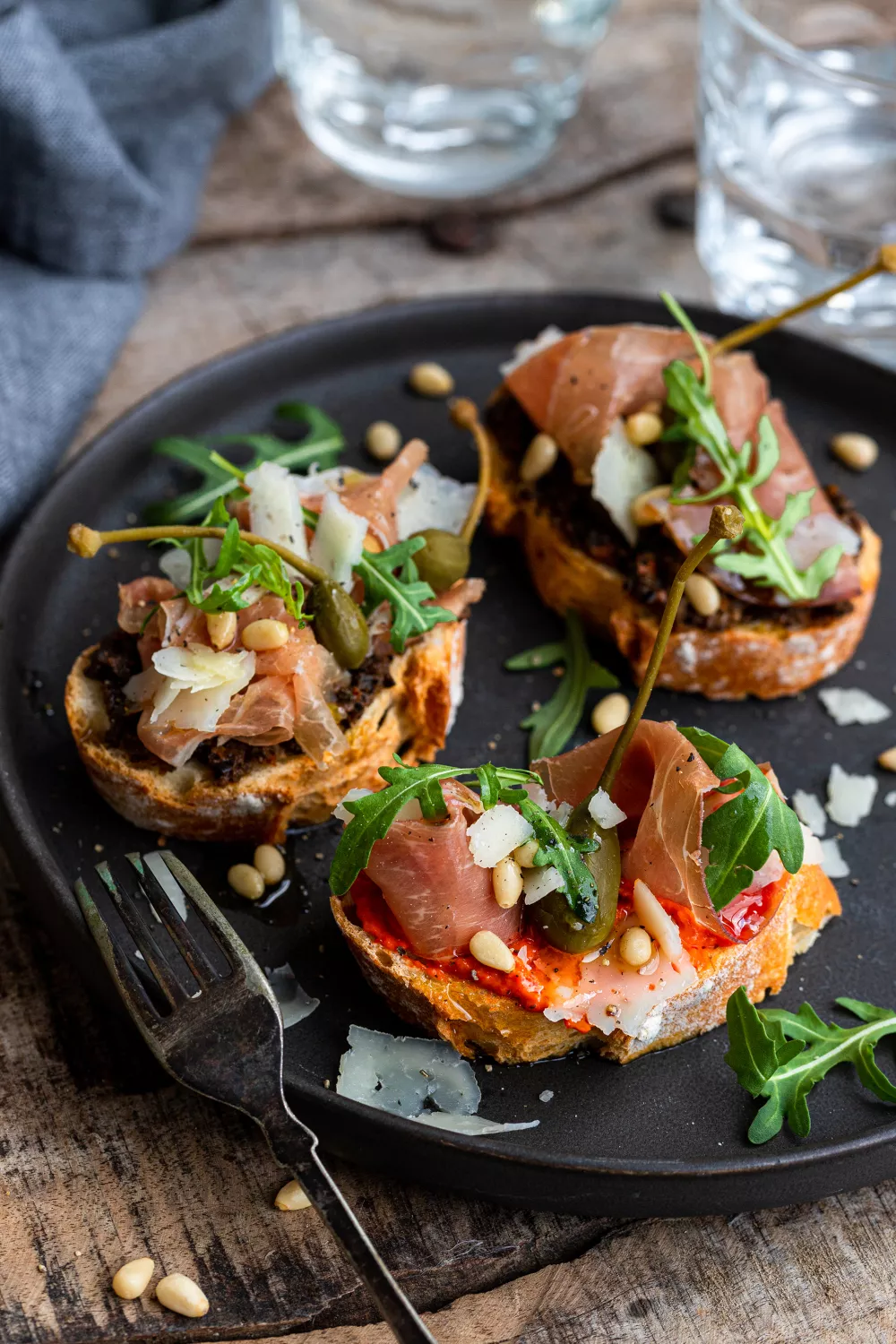 Verdeel vervolgens over ieder sneetje brood ½ plakje proscuitto, 2 appelkappertjes, stukjes manchego, pijnboompitten en rucola.