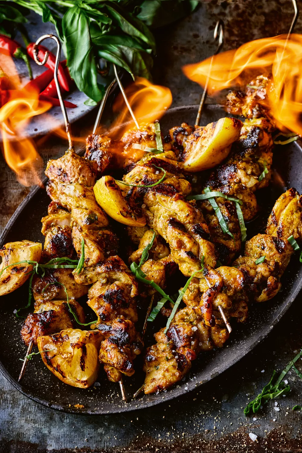 Piri piri kip van sappige kippendijen in een vurige marinade van Thai red chillies, gerookt paprikapoeder, knoflook en verse koriander en basilicum levert een zinderende, rokerige smaak op de BBQ. In blokjes gegrild op satéprikkers en afgewerkt met gegrilde citroen is dit perfect voor zomerse diners of een relaxte borrel in de tuin. Pas de hitte aan door de zaadjes te verwijderen of milde pepers te gebruiken en marineer minimaal drie uur voor optimale smaak.