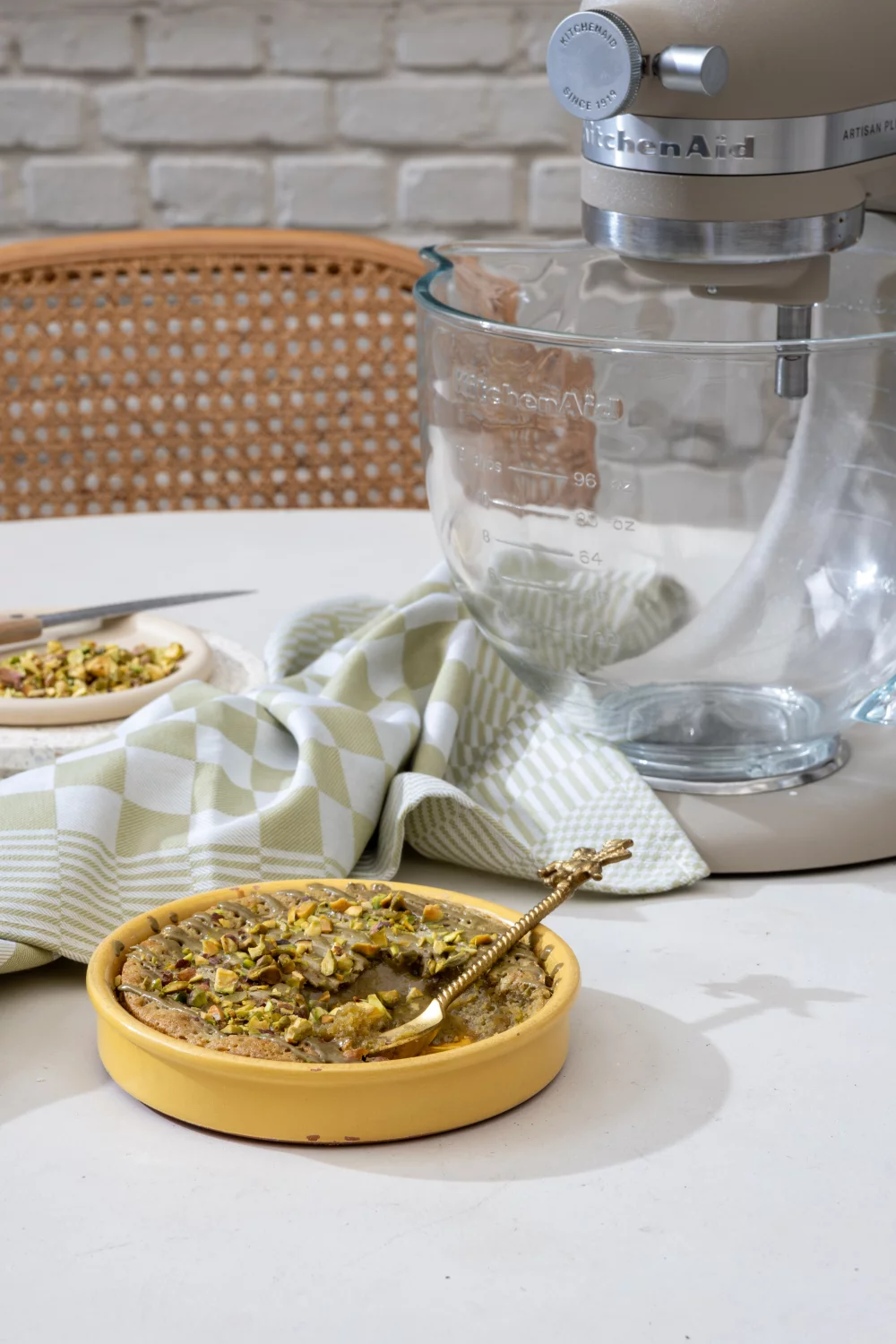 Haal de potjes uit de oven en werk ze nog af met een laagje pistachepasta en fijngehakte pistachenootjes.