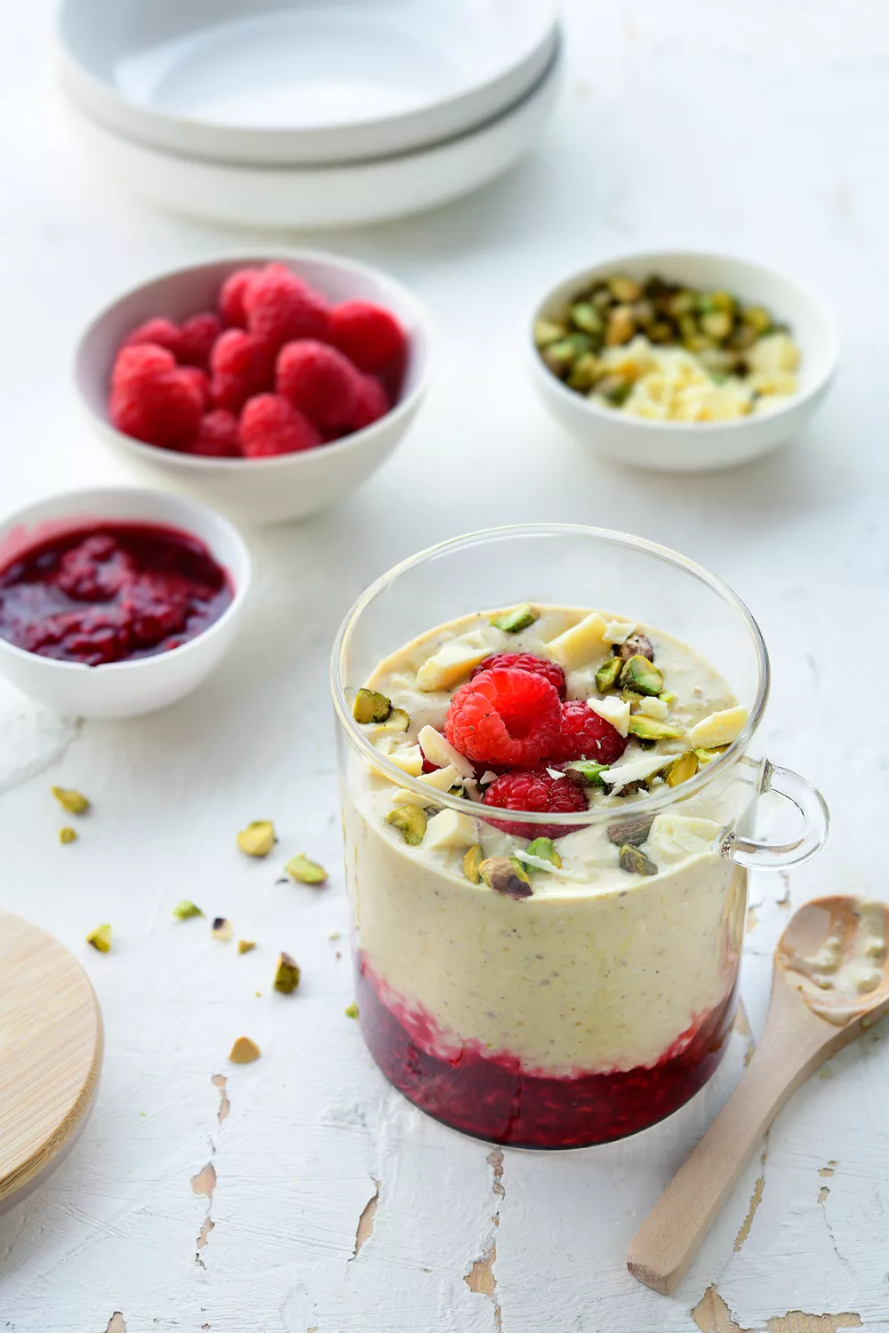 Begin je dag goed met deze romige pistache oats met frambozen: plantaardige yoghurt, amandeldrink en pistachepasta zorgen voor een nootachtige basis, terwijl de frambozencompote en verse fruit topping zorgen voor een frisse en zoete toets. Deze overnight oats zijn ideaal als gezond ontbijt, makkelijk klaar te maken én perfect voor drukke ochtenden.