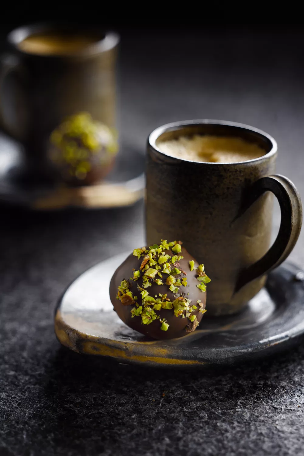 Doop de bonbons in de chocolade, laat ze uitdruipen op een satéstokje. Bestrooi elke bonbon met de resterende fijngehakte pistachenoten. Laat afkoelen en serveer de bonbons met een cappuccino of thee.