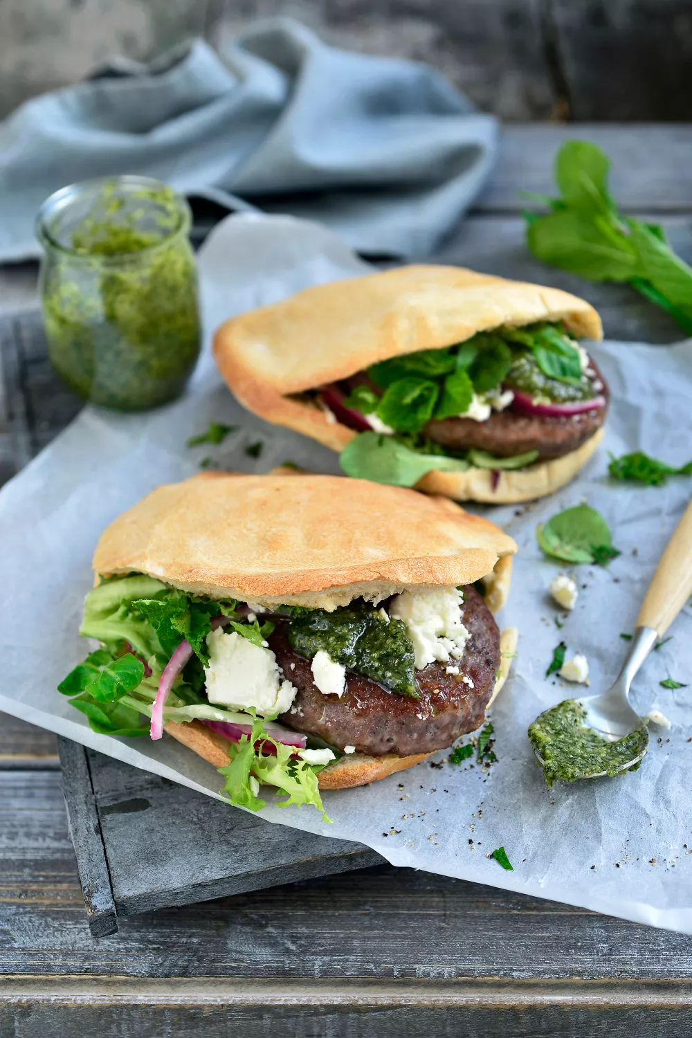 Pitabroodjes met lamsburgers, muntpesto en gepekelde rode ui