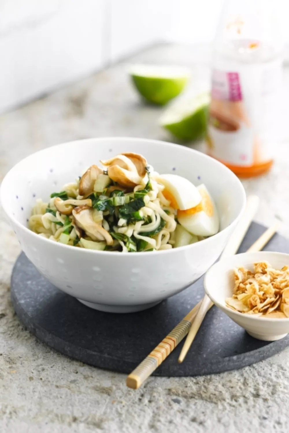 Frisse pittige eiernoedels met paksoi en shiitake vormen een snelle Aziatische maaltijd boordevol texturen dankzij geroosterde amandelen en krokante gefrituurde uitjes. De noedels worden kort gewokt met limoensap, vissaus en chilisaus voor een zilt-pittige dressing die frisse zuren en umami combineert. Met partjes hardgekookt ei erbij serveer je een hartige, vullende maaltijd voor doordeweekse avonden of gezellige etentjes.