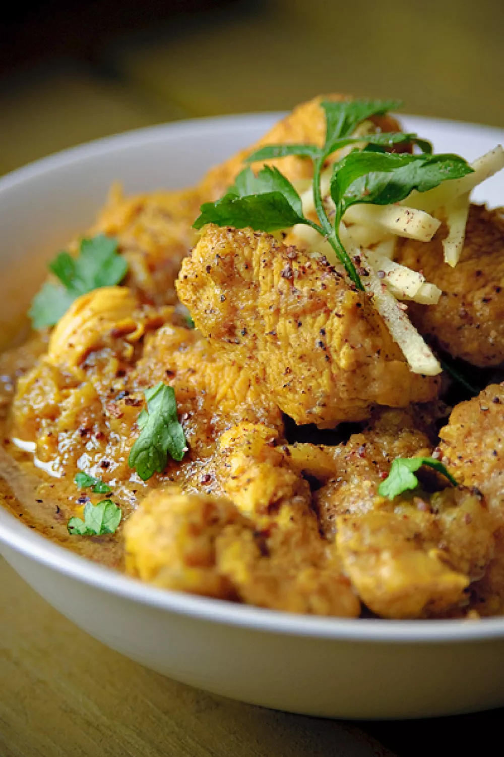 Pittige kip met zwarte peper, verse gember, knoflook en een vleugje citroen levert een warme, aromatische maaltijd die perfect is bij rijst en gestoomde broccoli. De kip wordt eerst gemarineerd, daarna kort geroerbakt en rustig gestoofd in een uienpuree met groentebouillon zodat alle smaken intrekken. Een eenvoudig, hartig gerecht voor doordeweekse avonden of koude seizoenen.