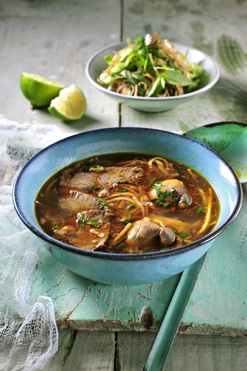 Verdeel de noedels en het vlees over kommetjes en overgiet met de hete bouillon. Geef er de kruiden apart bij.