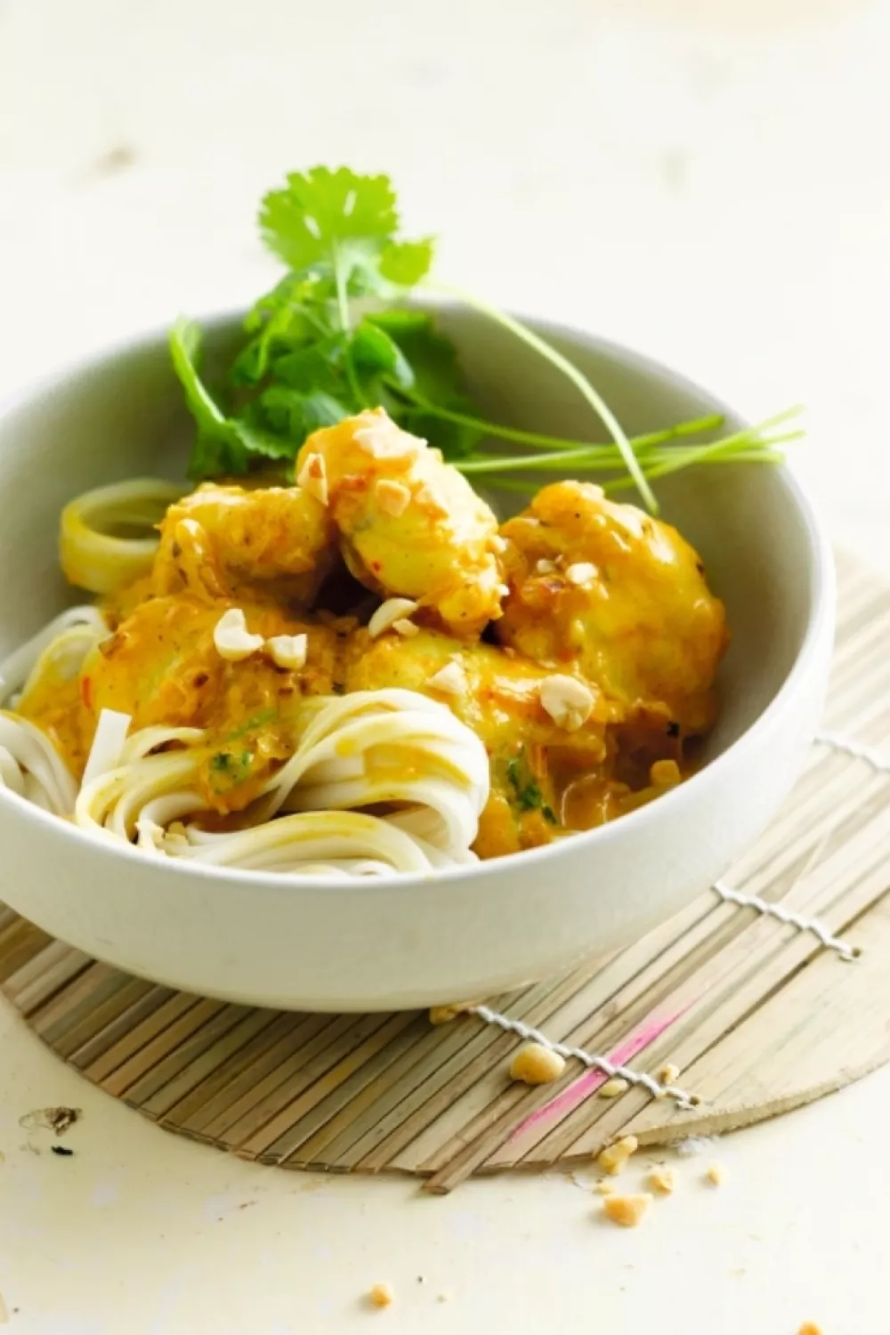 Deze pittige zeeduivel met tarwenoedels combineert malse vis, romige currysaus en zoete mangochutney tot een smaakvol Aziatisch geïnspireerd wokgerecht. Met een snelle roerbaktechniek en kruiden als sambal, gember en kurkuma zet je in een handomdraai een verwarmende doordeweekse maaltijd op tafel die ook feestelijk genoeg is voor gasten. Werk af met verse koriander en geroosterde pinda's voor een frisse en krokante toets.