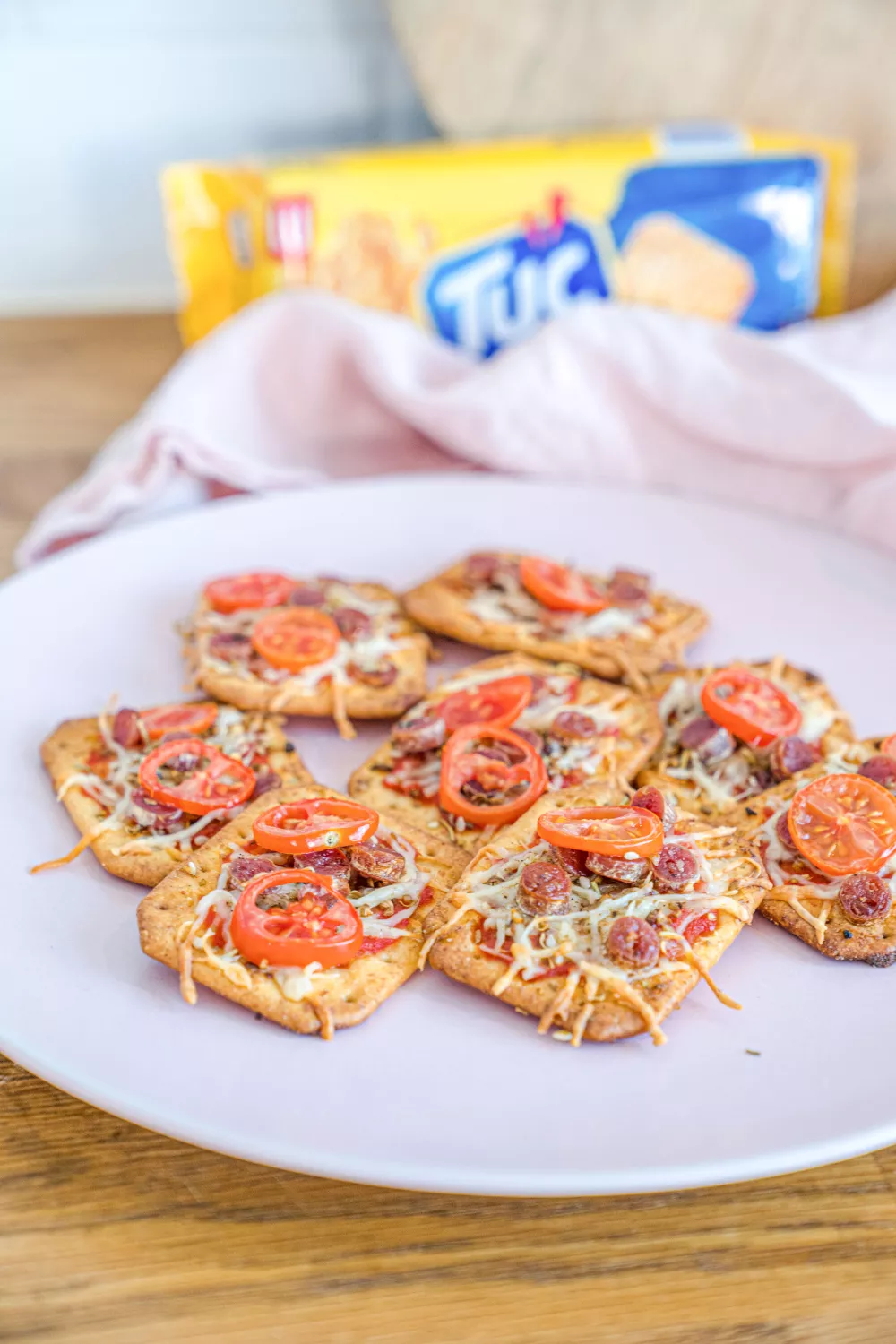 Knapperige pizzacrackers met salami en verse kerstomaatjes zijn een snel borrelhapje, perfect voor feestjes, borrels of een zomerse picknick. Met TUC koekjes, een dun laagje tomatenpassata en geraspte kaas zet je in vijf minuten een smaakvol ovenhapje op tafel. Bestrooi met pizzakruiden voor extra Italiaanse smaak en serveer warm voor het beste resultaat.