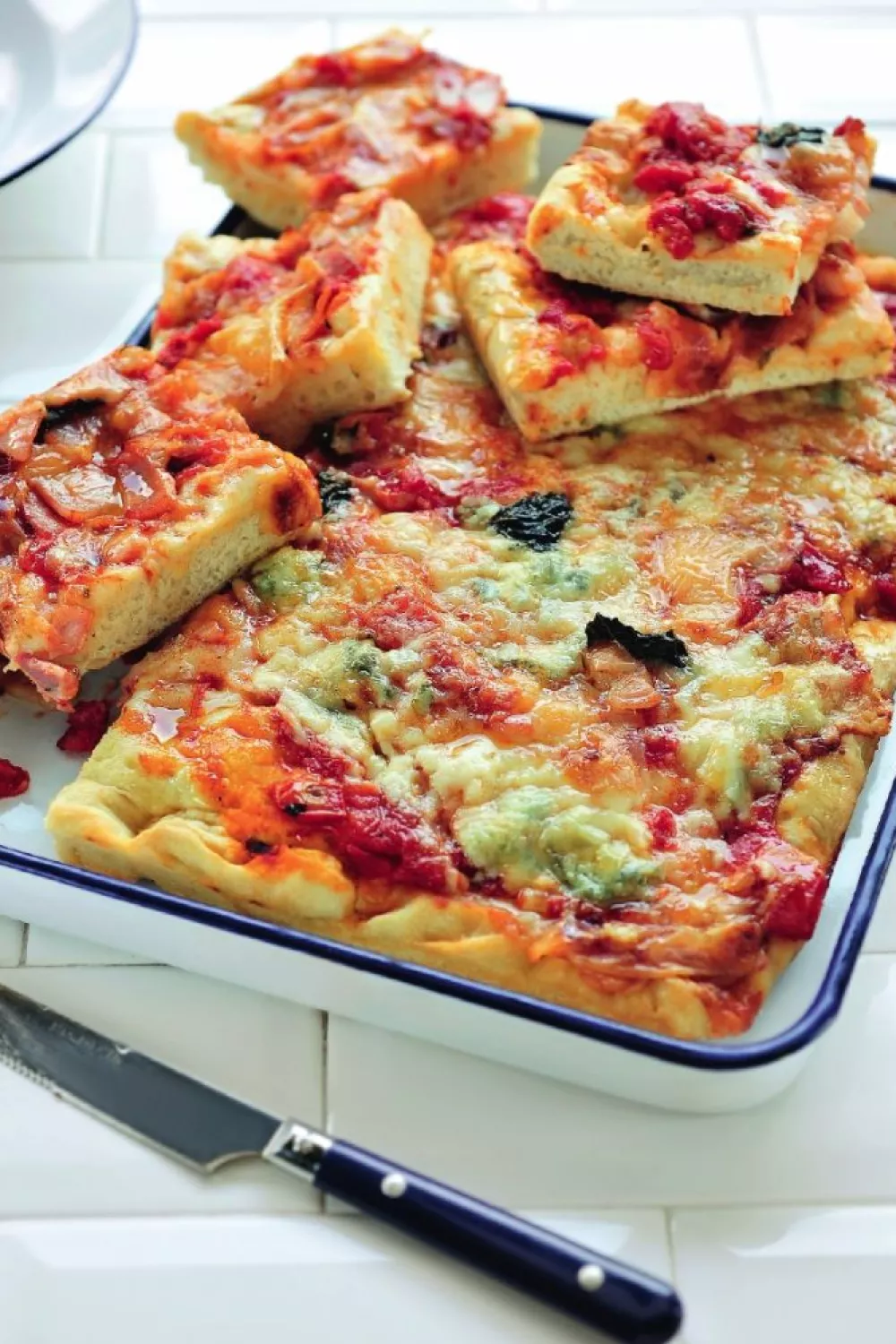 Deze Pizza Famiglia is een overheerlijk ovengebakken familierecept vol romige Italiaanse kazen en smeuige tomatensaus. Op een grote bakplaat wordt het deeg dun uitgerekt, een derde bestreken met basilicumtomatensaus en de rest rijkelijk belegd met mozzarella, taleggio, gorgonzola, Grana Padano en stukjes ham. Ideaal voor een gezellige weekendmaaltijd, borrel of koude avonden wanneer comfortfood en samen eten centraal staan.