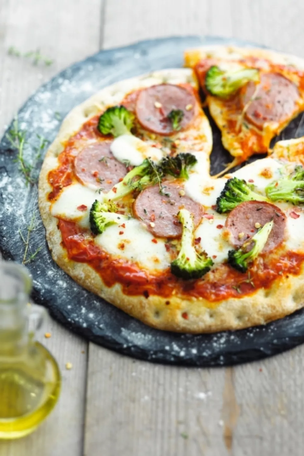 Deze huiselijke ovenpizza met broccoli, lunchworst en smeuïge mozzarella verandert restjes makkelijk in een snelle, smaakvolle maaltijd. Tomatensaus, verse tijm en een snuf chilivlokken geven frisse en licht pittige tonen bij de knapperige roosjes broccoli. Binnen tien minuten in een hete oven heb je een gezellige doordeweekse pizza die ideaal is als comfortfood of familiegerecht.