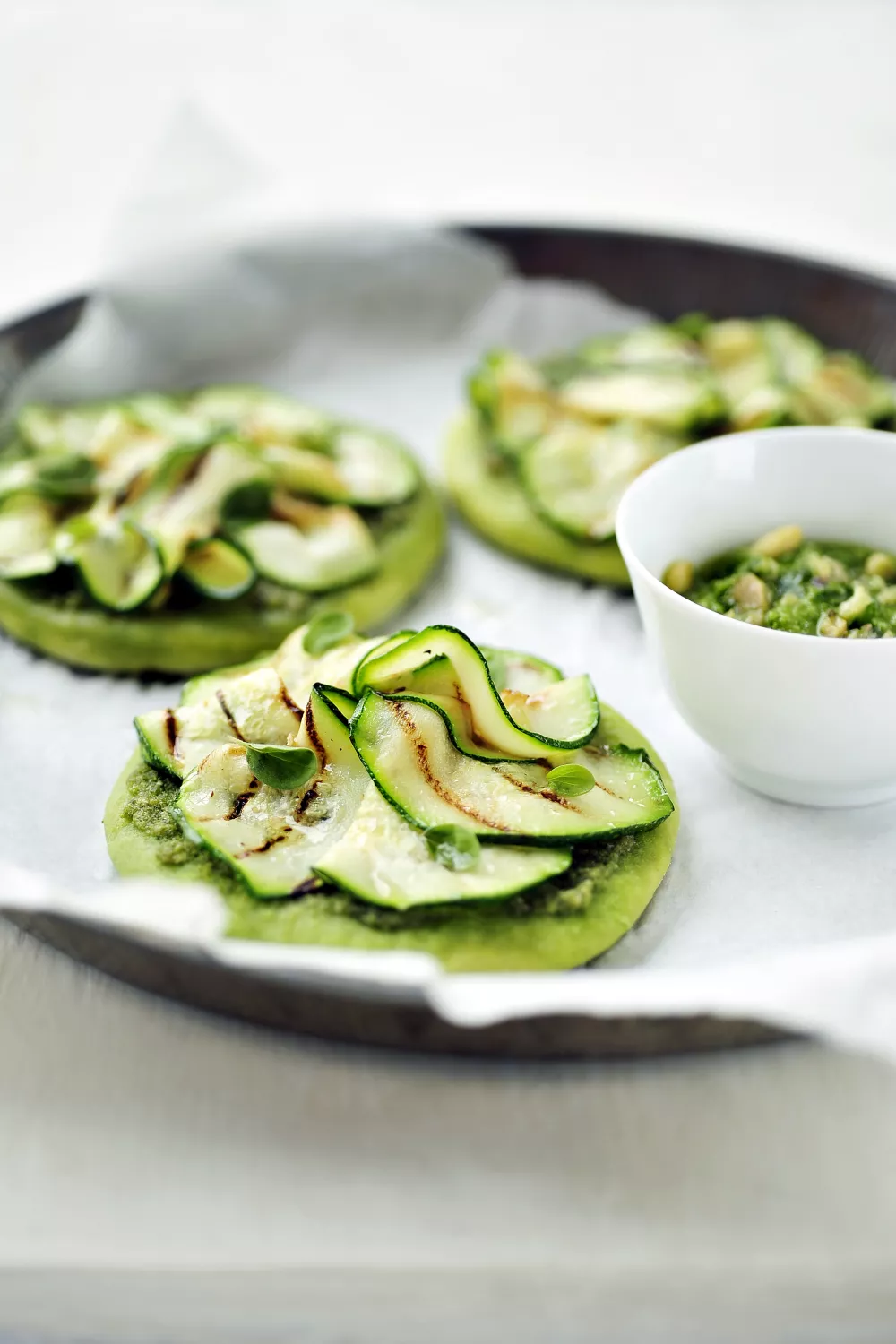Bestrijk de pizza’s met de pesto en schik er de courgetteschijfjes op. Verwarm de courgettepizza’s nog even kort in de oven, besprenkel met wat olijfolie en werk af met enkele basilicumblaadjes. Als je nog pesto over hebt kan je die erbij serveren.