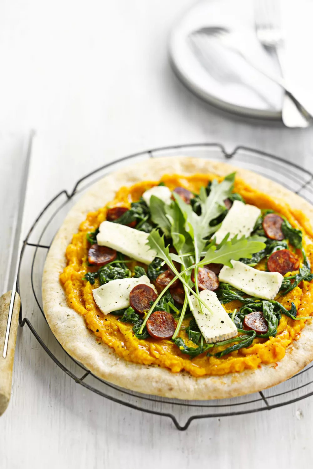Deze herfstachtige pizza met pompoen, pittige chorizo en romige taleggio combineert zoete karameltonen met hartige kruidigheid en smeltende kaas. De pompoen wordt zacht gestoofd en licht gekarameliseerd en als smaakvolle basis over een kant en klare pizzabodem uitgesmeerd, waarna spinazie, chorizo en taleggio in de oven samen smelten. Werk af met frisse raketsla en Provençaalse kruiden voor een gezellig avondmaal of smaakvolle borrelhap.