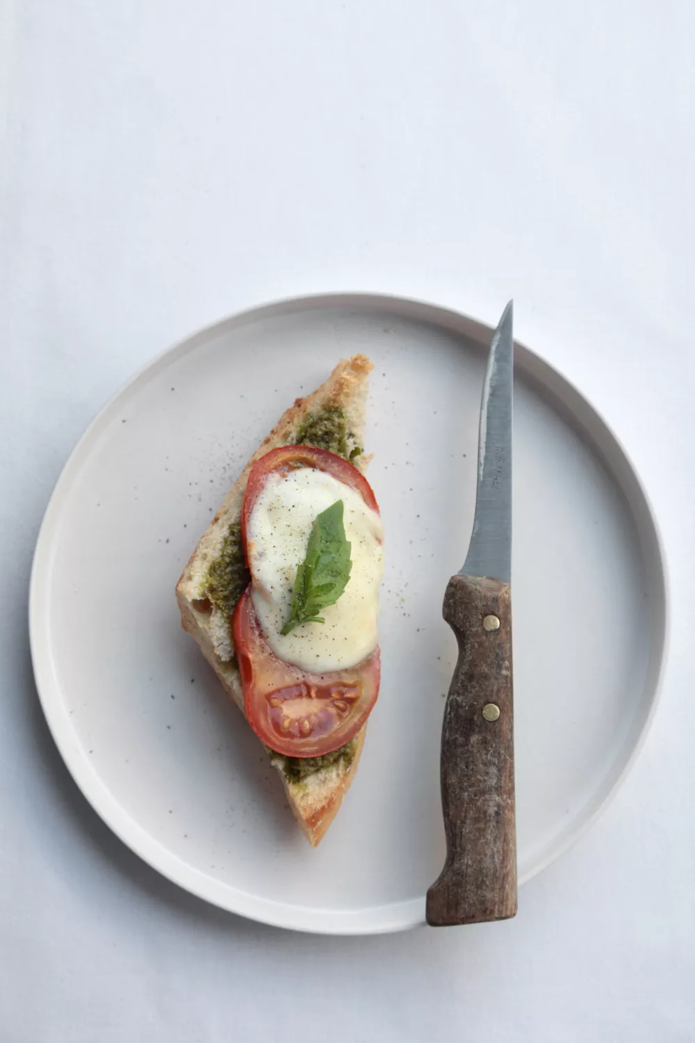 Snijd de tomaten en mozzarella in fijne plakjes. Snijd het brood overlangs in twee. Verdeel de pesto over de helften. Leg de schijfjes tomaat erop en dek af met de mozzarella. Bak ca. 10 min. in de oven op 180°C.