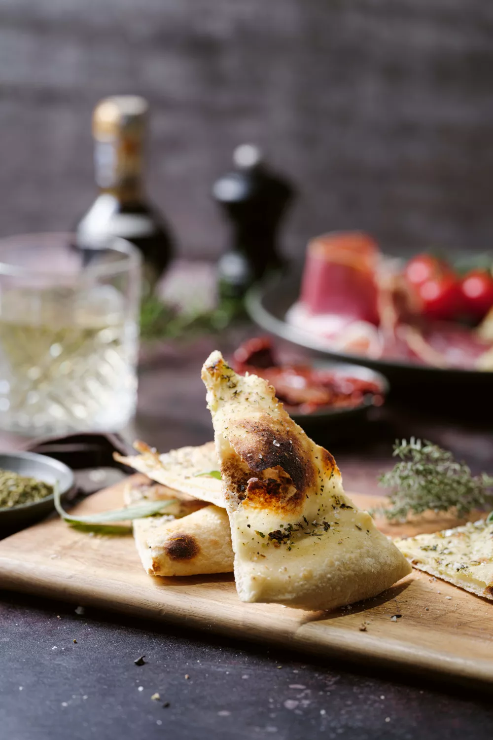 Luchtig pizzabrood van pizzadeeg met een goudbruine, knapperige korst en een rijke smaak van olijfolie, gesmolten boter en verse rozemarijn. Na kort voorbakken in de oven smeer je het brood royaal met het botermengsel en bestrooi je het met salie en zeezout voor een geurige, huiselijke toets. Heerlijk warm als borrelhap, bij de soep of als simpel bijgerecht bij een zomerse picknick of herfstige maaltijd.