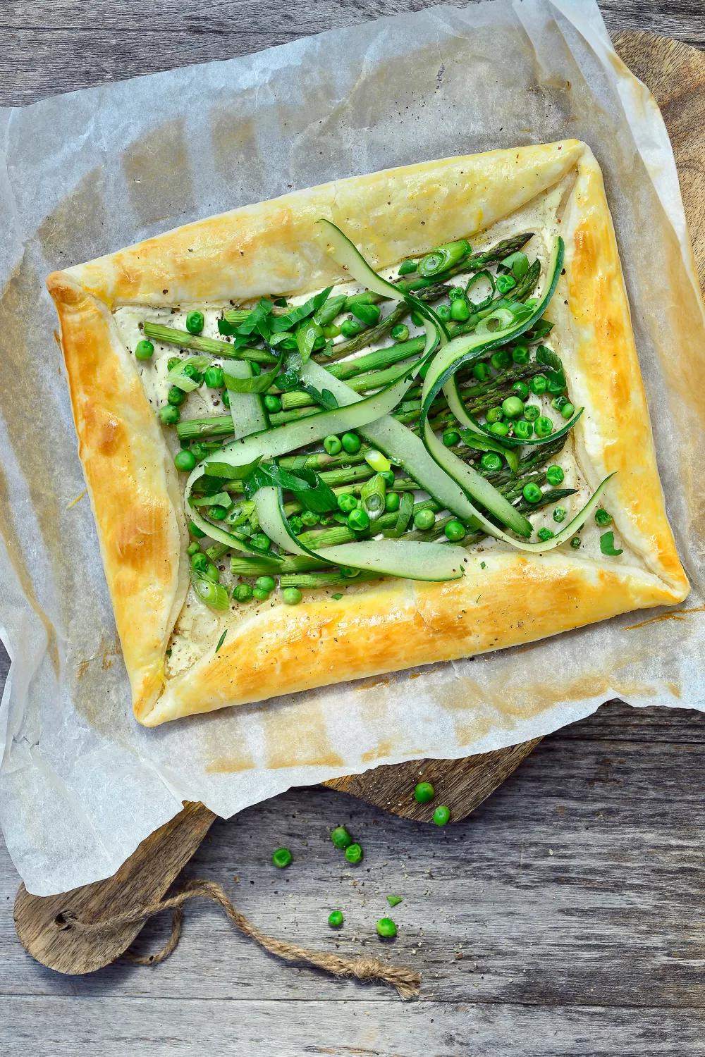 Vrolijke plaattaart met lentegroenten en knapperig bladerdeeg, gevuld met aspergepunten, erwtjes en courgettelinten op een romige kruidenkaasbasis met Griekse yoghurt. Kort blancheren van de erwtjes, het bladerdeeg beleggen en de randen bestrijken met losgeklopt ei zorgt voor een goudbruine korst na een korte bakbeurt in de oven. Perfect als lichte lunch of borrelhap in het voorjaar, afgewerkt met verse groene kruiden en een scheut olijfolie.