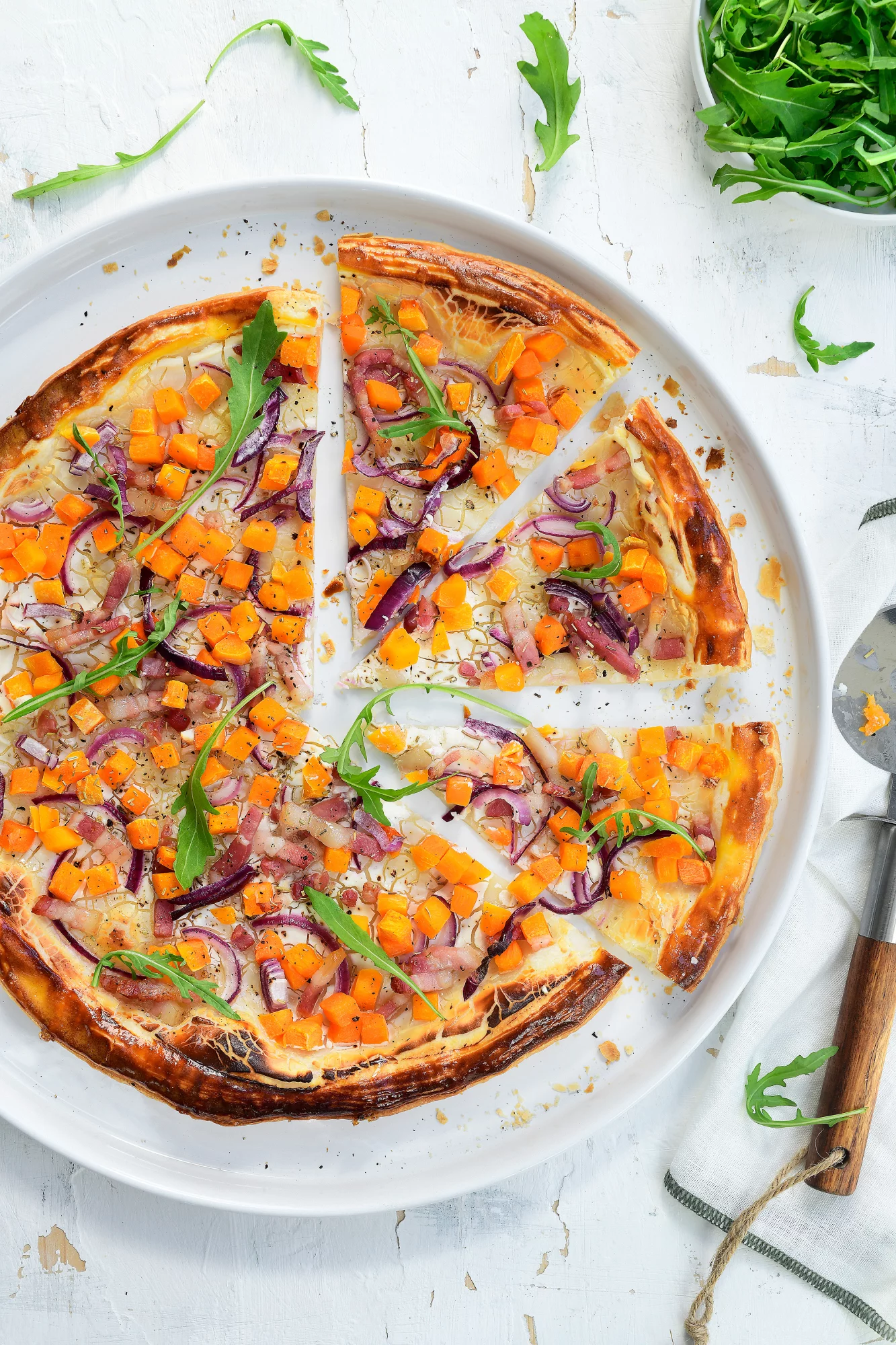 Snijd de ui in halve ringen. Rol het vel bladerdeeg uit en bestrijk het met een laagje van de luchtige geitenkaas. Strooi er de blokjes pompoen, de halve ringen rode ui en de spekblokjes over. Kruid met peper, zout en tijm.