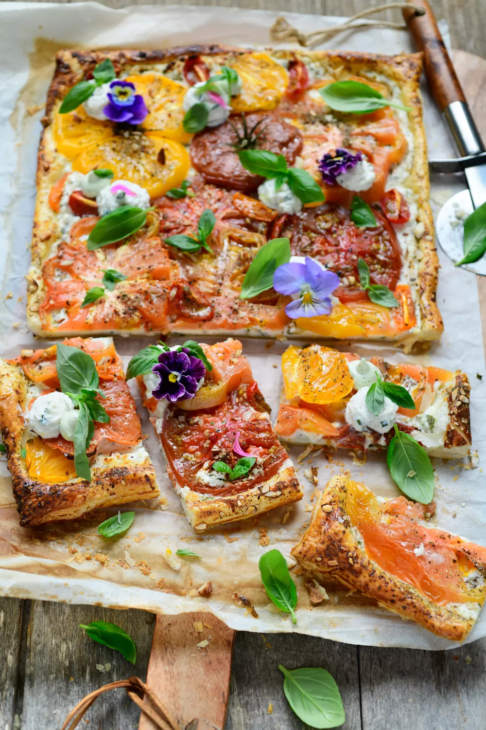 Een krokante plaattaart met romige ricotta, zongerijpte tomaten en geurige basilicum voor een lichte lunch of zomerse borrel. Het bladerdeeg wordt gevuld met een knoflookricotta en bestoven met Parmezaanse kaas, citroenrasp en dukkah voor een hartige, kruidige toets. Na het bakken werk je af met toefjes ricotta uit een spuitzak, verse basilicum en eetbare bloemetjes voor een feestelijke uitstraling.