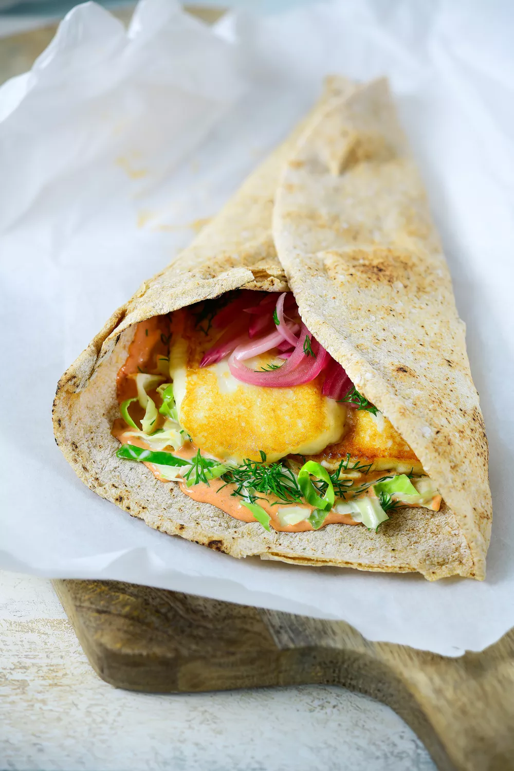 Knapperig platbrood gevuld met goudbruin gebakken halloumi, pittige harissamayonaise en fijn geschaafde witte kool voor een volle, hartige smaak. Ingelegde rode ui en frisse dille brengen zuur en aromatische frisheid, terwijl een scheut olijfolie het geheel een Mediterrane en oosterse touch geeft. Snel en gemakkelijk te bereiden, ideaal als informele lunch, streetfood of zomerse picknick.
