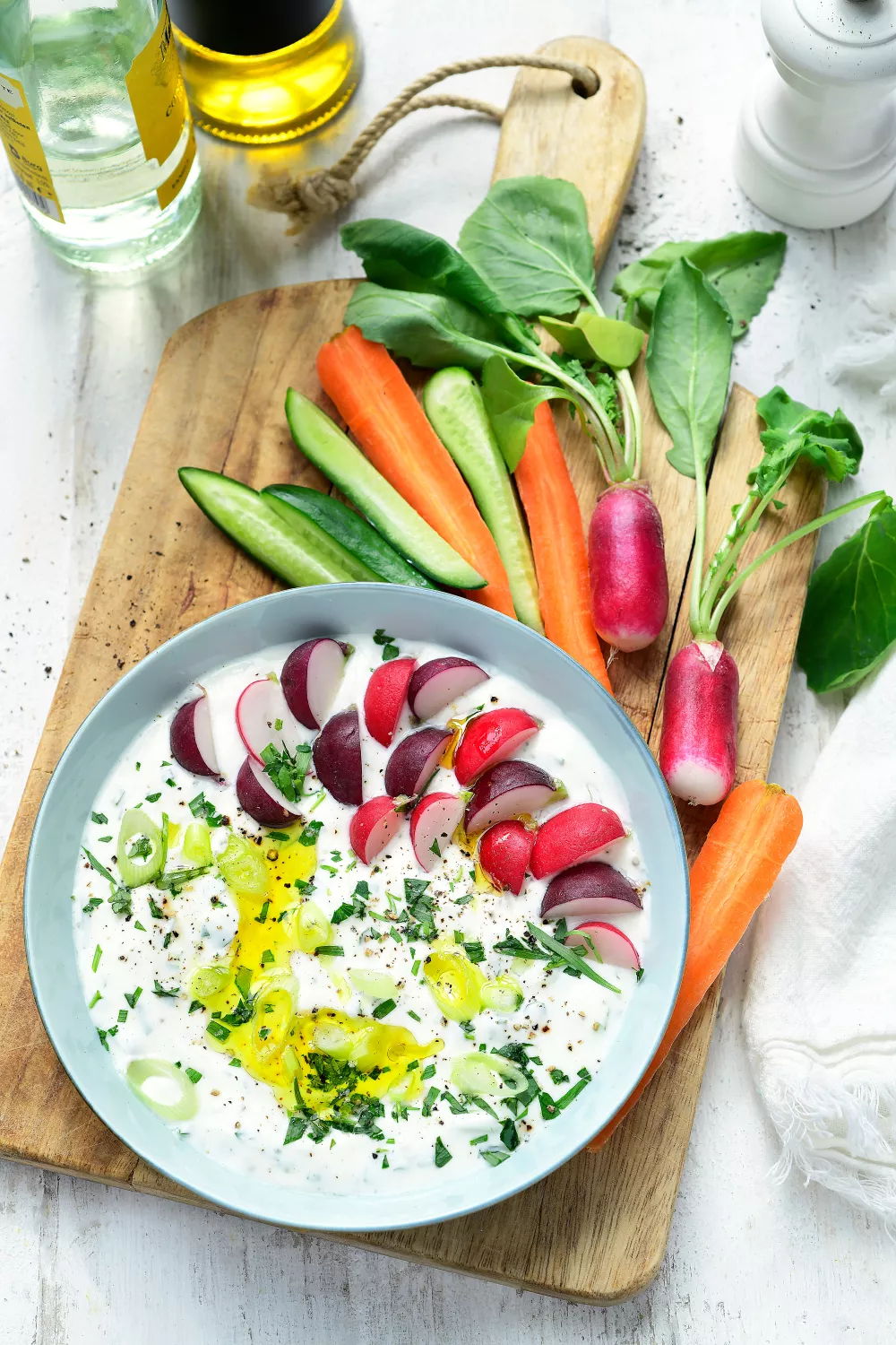 Lepel de plattekaasdip in een kommetje. Werk af met de resterende lente-ui en bladpeterselie. Bedruppel met de olijfolie en kruid met peper en zout. Serveer met de groentjes.