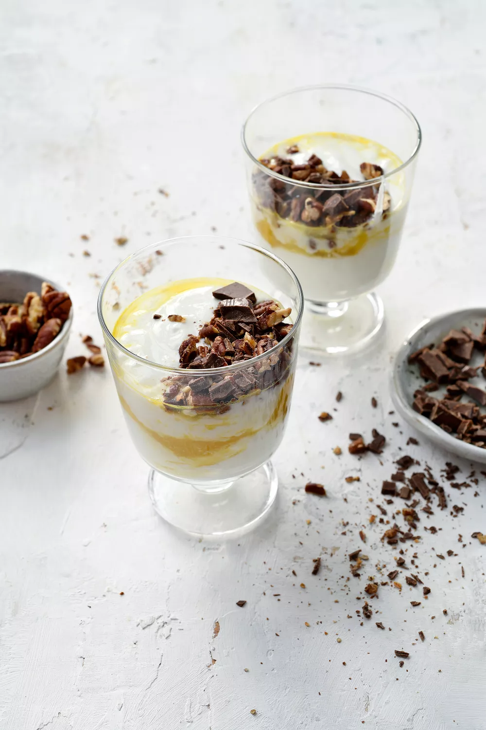 Romig plattekaasparfait met warme sinaasappelsaus, krokante geroosterde pecannoten en flintertjes donkere chocolade, ideaal als feestelijk dessert of luchtig brunchgerecht. De sinaasappel en honing worden zachtjes ingekookt tot een glanzende saus terwijl de pecannoten kort in de pan geroosterd worden voor extra crunch. Simpel en fris, perfect voor zomerse of winterse momenten.