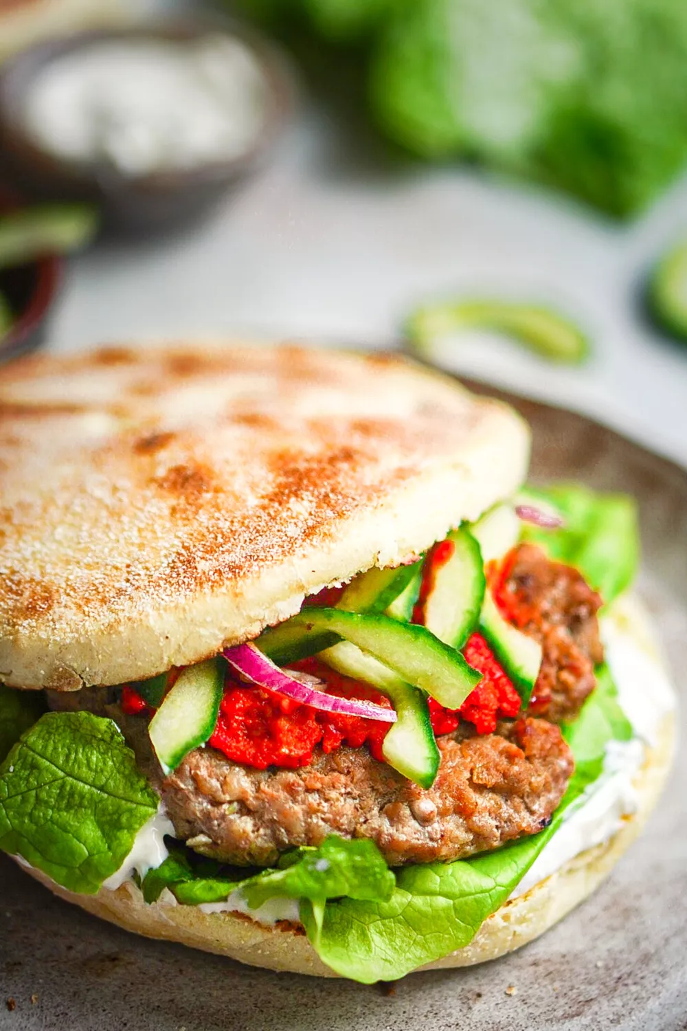 Snijd de pitabroodjes open en bestrijk met de kajmak. Leg daar een slablad op en vervolgens de hamburger. Lepel daar wat ajvar op en maak af met de komkommer en de rode ui.