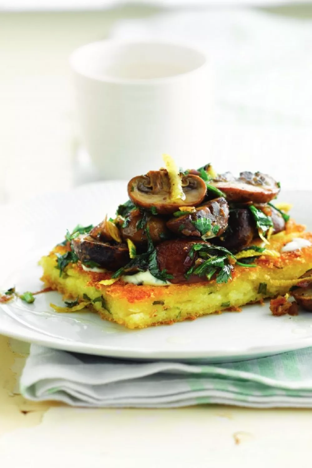 Romige polenta wordt in een bakblik gezet, afgekoeld en in plakjes goudbruin gebakken als stevige basis voor sappige kastanjechampignons die kort worden aangebakken met lente-ui en citroenrasp. Een pittige wasabimayonaise brengt een frisse, umamirijke kick bij de hartige topping. Perfect als borrelhapje of lichte lunch, ideaal in het paddenstoelenseizoen maar ook het hele jaar door.