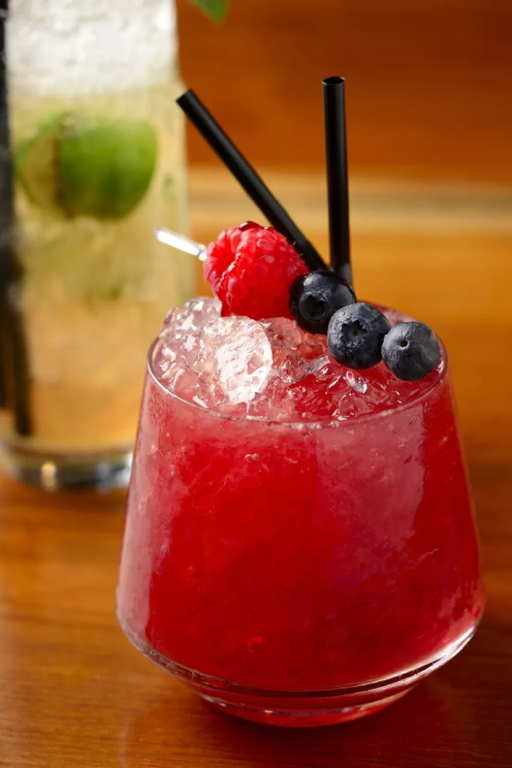 Zeef de cocktail in het delmonicoglas. Vul het glas op met gepileerd ijs. Werk af met granaatappelpitjes.