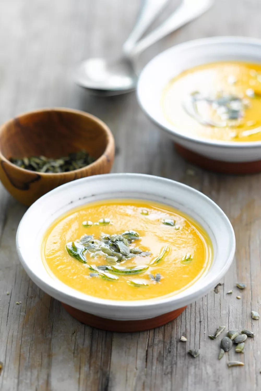 Serveer met een scheutje kruidenolie en geroosterde pompoenpitten.