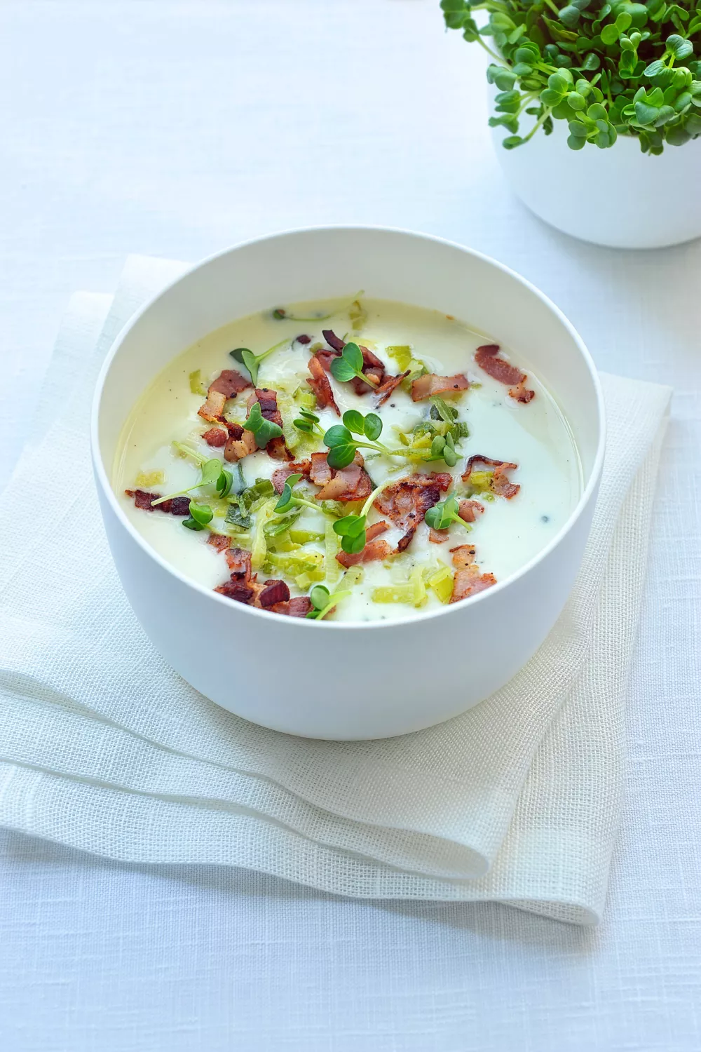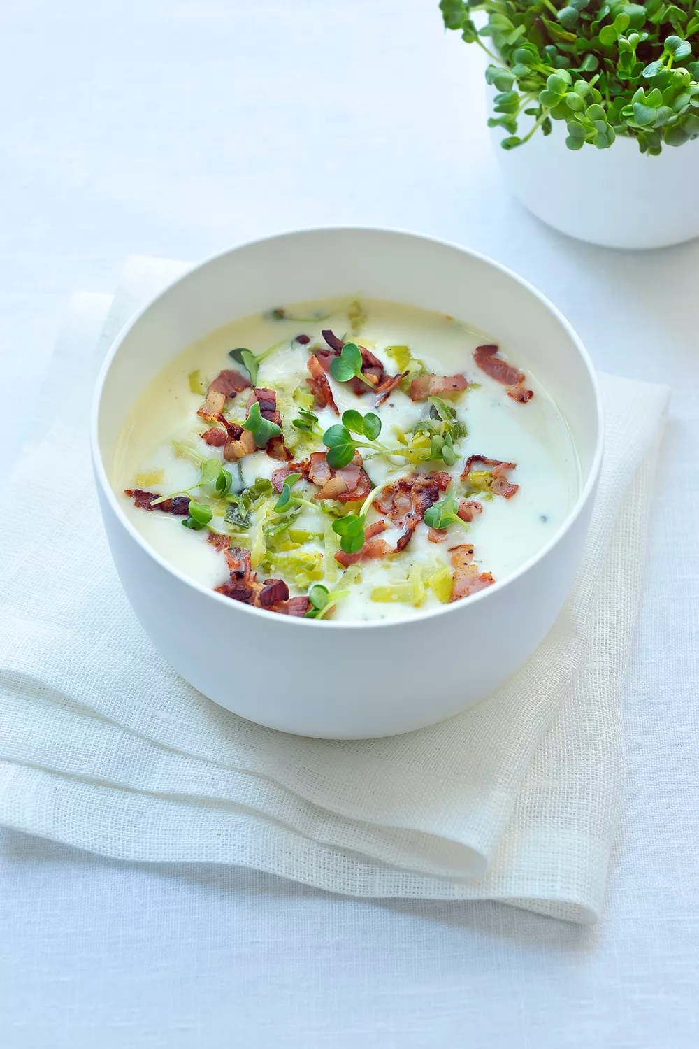 Romige preisoep met zachte aardappel en volle room krijgt een zoute crunch door krokant gebakken spekjes. De soep wordt rustig gestoofd en daarna glad gepureerd voor een fluweelachtige textuur, afgewerkt met extra preigroen en zeesla. Ideaal als troostrijke winterlunch of verfijnde voorgerecht bij een gezellige maaltijd.