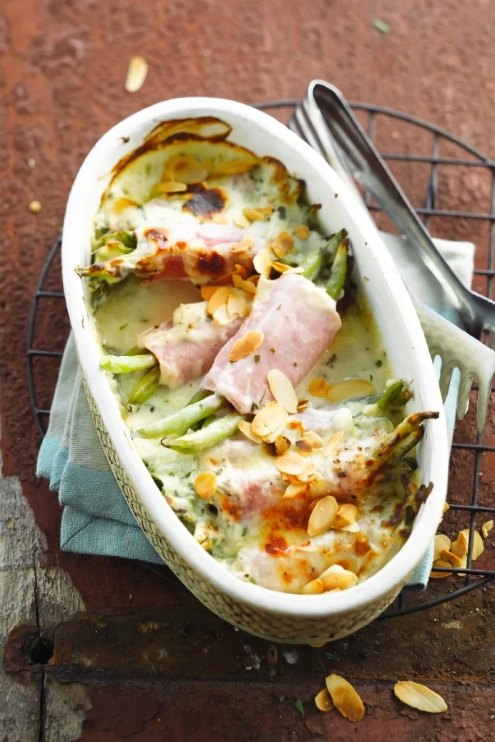 Knapperige prinsessenboontjes gewikkeld in ham en overgoten met een romige Comté kaassaus, afgebakken met plakjes mozzarella tot een goudbruine korst. Het eenvoudige recept combineert blancheren, rollen en ovengaren voor een hartig comfortfood dat perfect werkt als bijgerecht of als hoofdgerecht met aardappelpuree, bij een doordeweekse avond of een gezellig lente- of winteretentje. Met peterselie en een vleugje nootmuskaat krijgt het gerecht frisse tonen en een warme, rijke smaak.