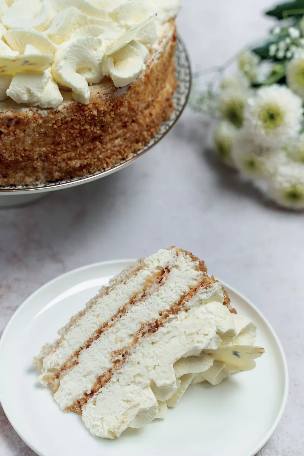 Klop de slagroom met de suiker stijf. Doe de slagroom in een spuitzak met een kartelspuitmondje. Leg de eerste bodem met de gebakken kant onder op een taartkarton. Spuit er een laag slagroom op. Leg de tweede laag schuim erop en breng weer een laag slagroom aan. Dek het af met de laatste plak schuim en leg deze nu met de gebakken kant boven. Smeer de taart rondom en aan de bovenkant af met slagroom. Zet de randen aan met nougatine. Spuit de rest van de slagroom op de taart en decoreer de taart met chocolaatjes. Zet de taart minimaal 4 uur in de koelkast voordat je hem aansnijdt.