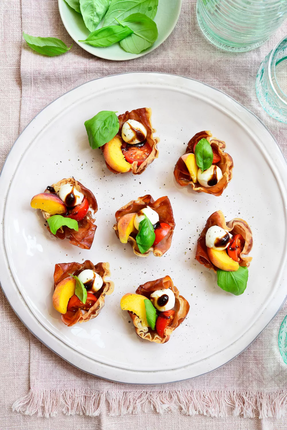 Deze Prosciutto Caprese cups zijn heerlijke Italiaanse hapjes: krokante prosciutto gevuld met mozzarella, tomaat, perzik en basilicum. Afgewerkt met balsamicocrème. Simpel, smaakvol en perfect voor feestjes.
