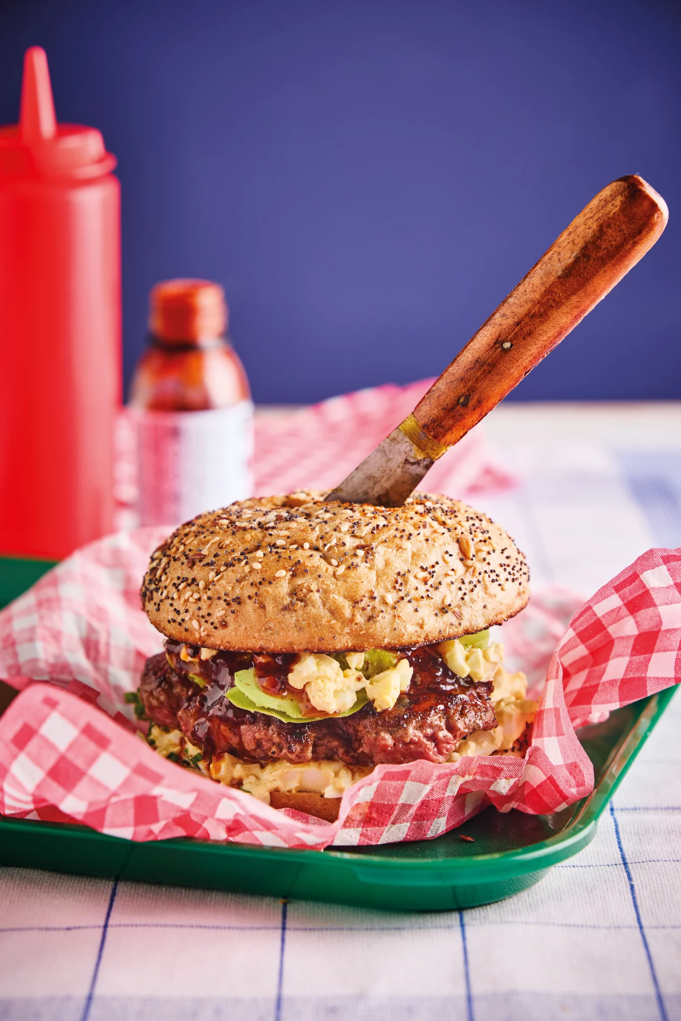 Beleg de onderste helft van elk broodje met een royale laag eiersalade. Leg daarop een gebakken burger en verdeel er veel avocado over.