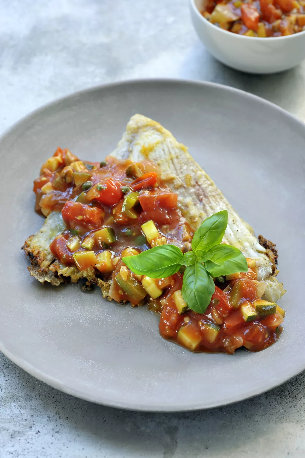 Ga even met het keukenmes over de olijven en kappertjes zodat ze grofgehakt zijn. Werk de saus af met de olijven, de kappertjes, de verse basilicum en de citroenzeste. Voeg nog een scheutje olijfolie toe en breng op smaak met peper en zout. Tast toe!