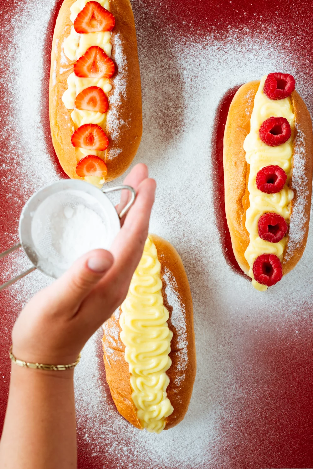 Maak ondertussen de aardbeien schoon en snijd in plakjes. Snijd het witte broodje in net als een hotdogbroodje en doe de banketbakkersroom erin. In principe gaat dit het makkelijkst met een spuitzak.