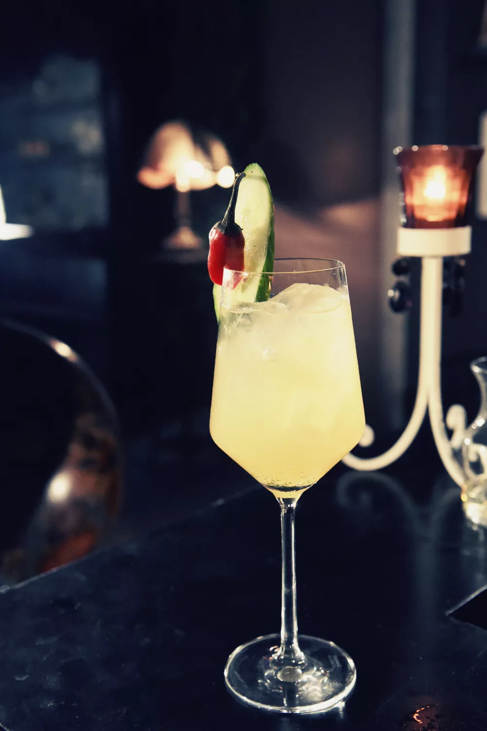 Werk het glas af met een schijfje komkommer en het hoedje van een chilipeper.
