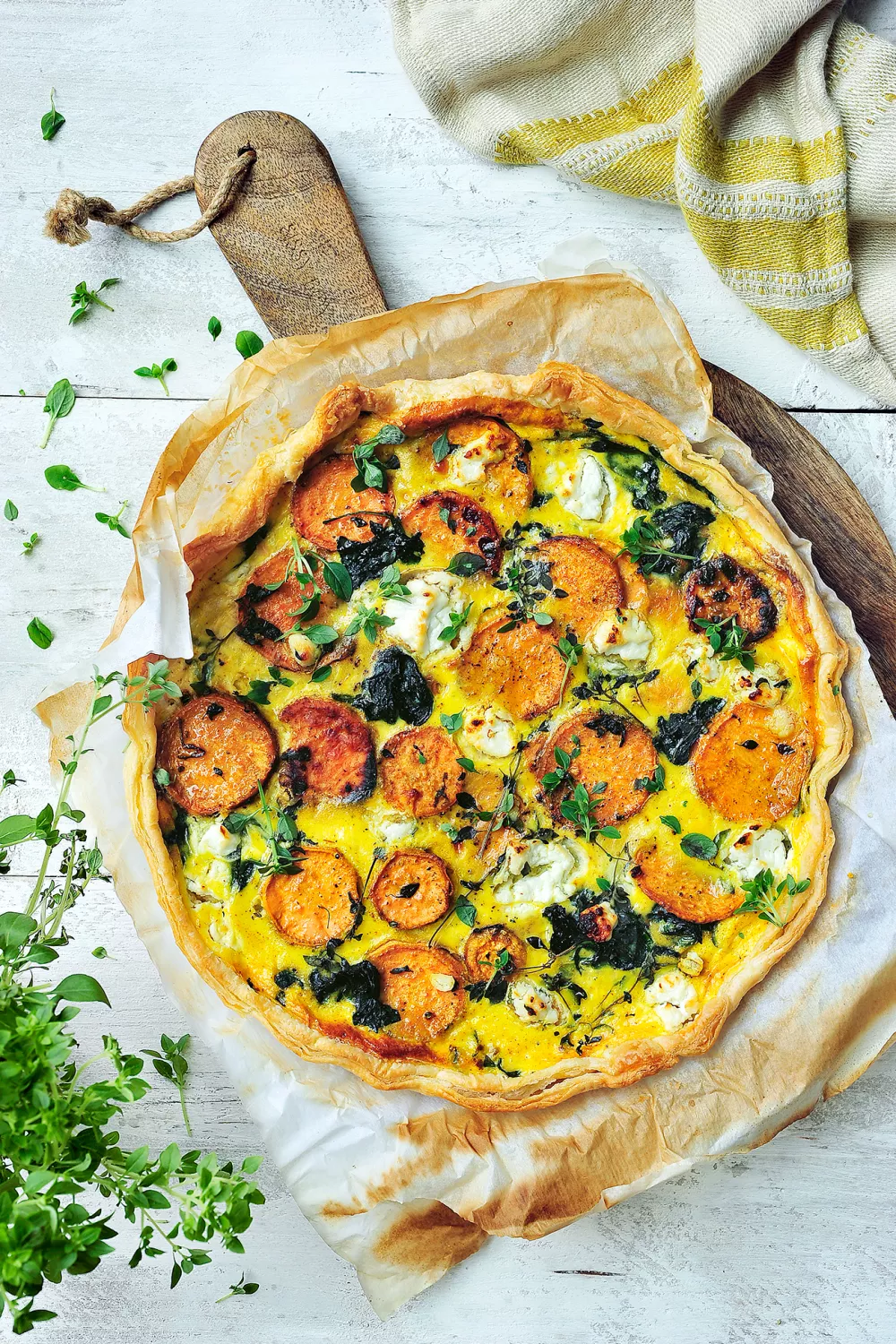 Quiche met zoete aardappel, spinazie en geitenkaas