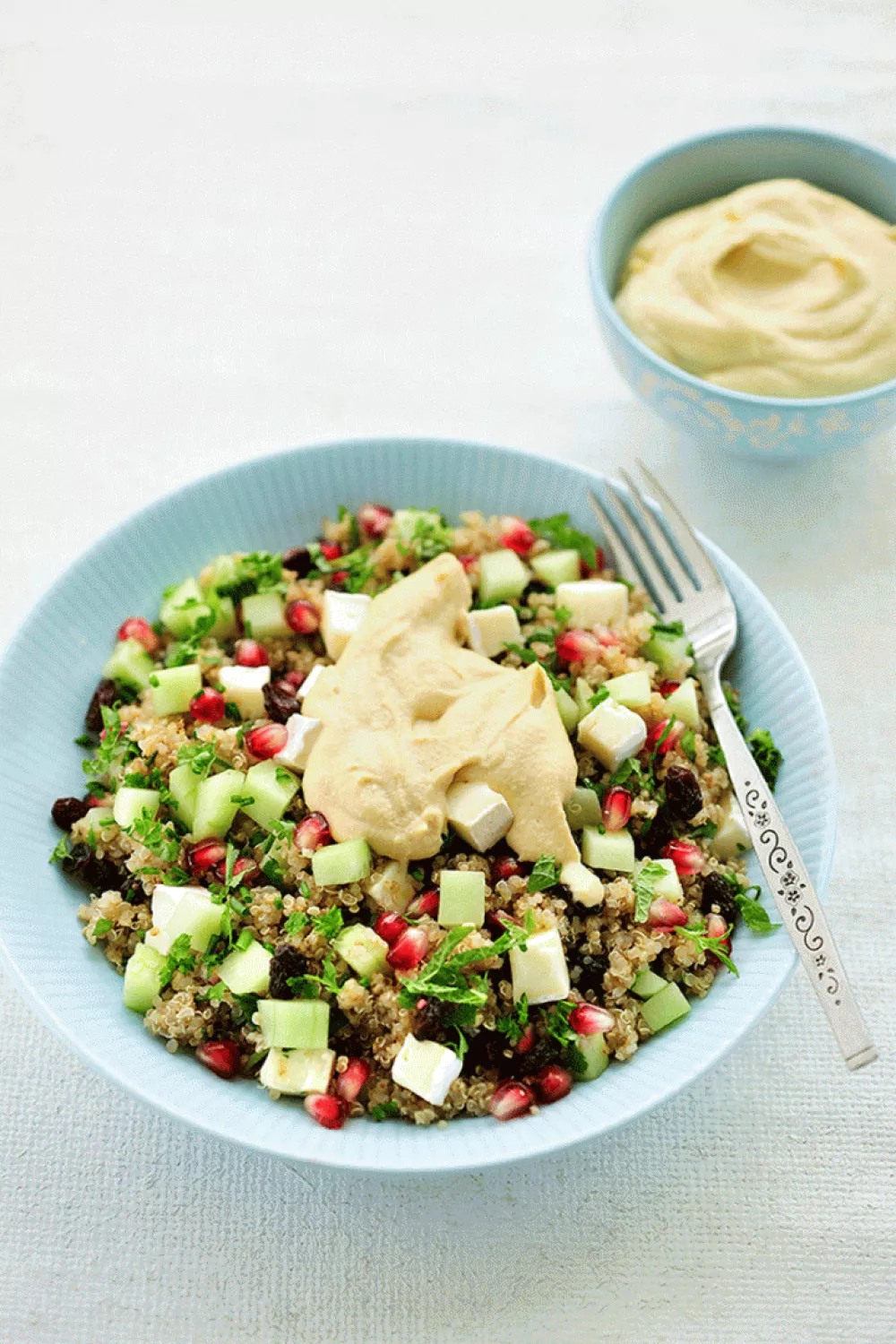Een kleurrijke quinoasalade boordevol texturen en smaken: knapperige komkommer, sappige granaatappelzaadjes en romige brie gecombineerd met een smeuïge kikkererwtenhummus op basis van tahin. Simpele technieken zoals quinoa koken en kikkererwten pureren maken dit gerecht snel en toegankelijk. Perfect als lichte lunch, zomers bijgerecht of picknick met mediterrane en middenoosterse accenten.