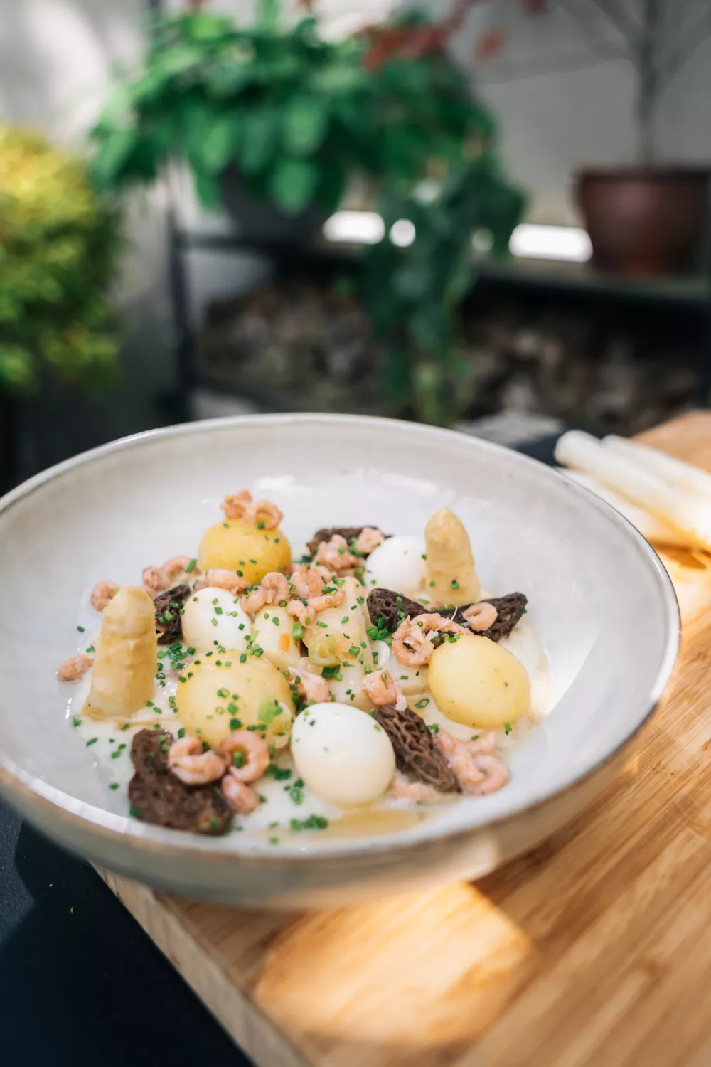 Schep een bodempje van het aspergesausje in een diep bord. Lepel er wat aardappelen, asperges en kwarteleitjes bovenop. Strooi er nog wat grijze garnalen over en werk het bordje nog af met de fijngehakte bieslook.