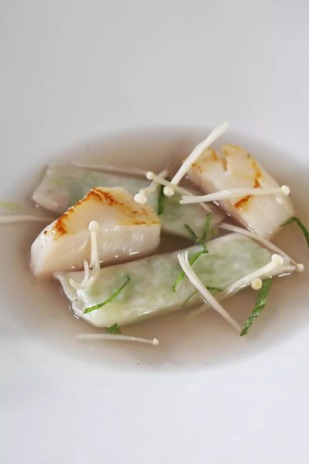 Deze lichte ramen met heldere bouillon en zachte Sint-Jacobsvruchten brengt Japanse umami van nori en sojasaus samen met de frisse bite van spitskool en enoki. Kleine ravioli van rijstvel gevuld met gestoofde witte kool en spekblokjes geven lekkere textuur tegenover luchtig gebakken coquilles. Een verfijnde lente- of feestmaaltijd waarbij stomen en kort bakken de delicate smaken bewaren.