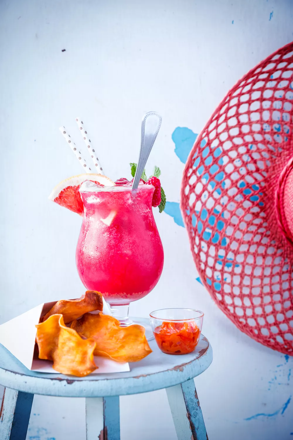 Friszure frambozencoulis en sprankelend pompelmoessap met tonic vormen een levendig drankje, perfect voor zomerse borrels en een luchtig aperitief. Daarbij knapperige chips van dun gesneden zoete aardappel, goudgeel gefrituurd en licht gezouten, voor een hartig tegenwicht. Zacht gestoofde rode pepers in olijfolie en verse munt met een vleugje honing en citroen maken het geheel fris en verrassend.