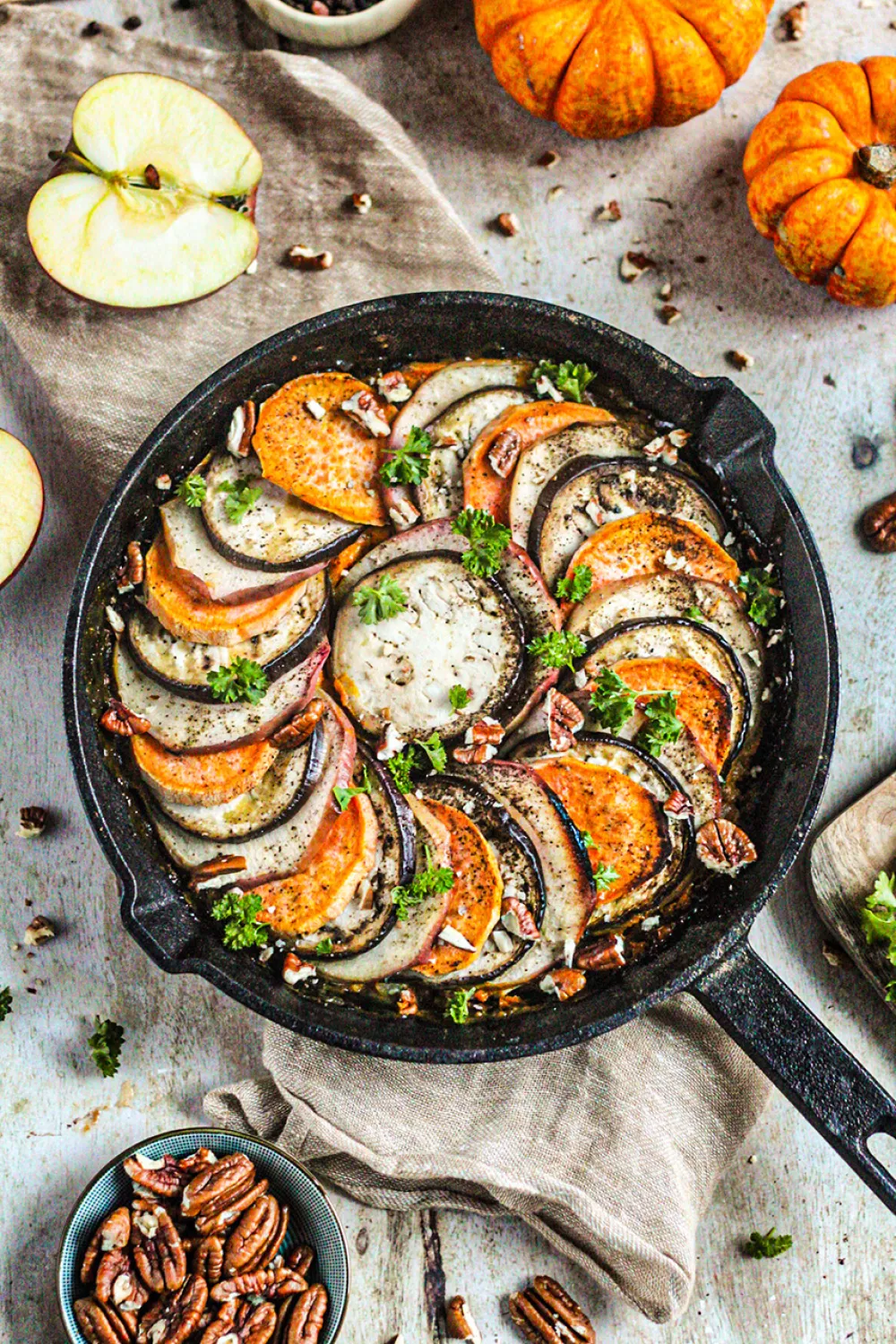 Haal de pan van het vuur en verdeel de pompoensaus in een gietijzeren pan of een ovenschaal. Leg de plakjes gekookte zoete aardappel, appel en aubergine om en om mooi gedrapeerd over de pompoensaus op de bodem. Je kunt ze rechtop zetten of over elkaar heen leggen.